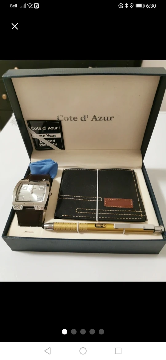 My Cote D'Azur Box Set includes; Watch, Wallet, Pen & Cleaning Cloth all are in a lovely blue Cote D'Azur box! Get it as a gift for someone special or just yourself!