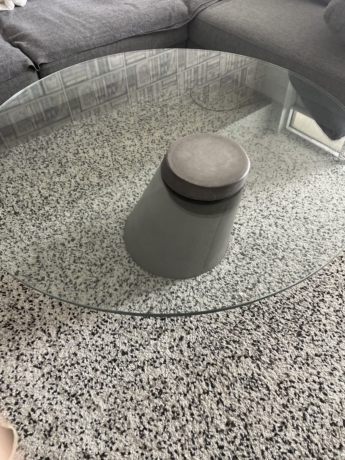 The top of the table is glass, and the base is concrete, it’s a beautiful designer table, but it’s heavy and requires two strong people and a dolly to move it.
