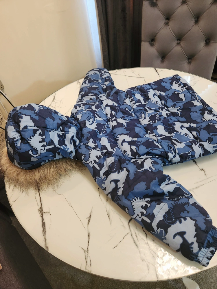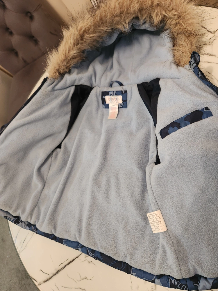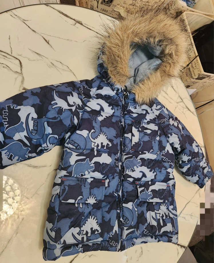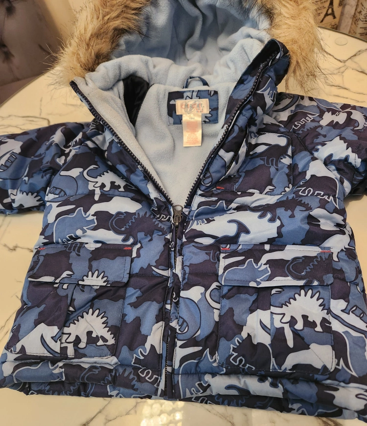 Cherokee Toddler Boys Winter puffer coat-Sz. 18-24 mnths (Fits like a 2T) -Only $20! -Excellent condition! -Fleece-lined interior, fur-lined hood, Dinosaur patterned blue camo-look. Cuffed sleeves, functional inner pocket, velcro outer pockets. Very warm, cozy & plush! -Pick up @ Bathurst & Steeles, North York.