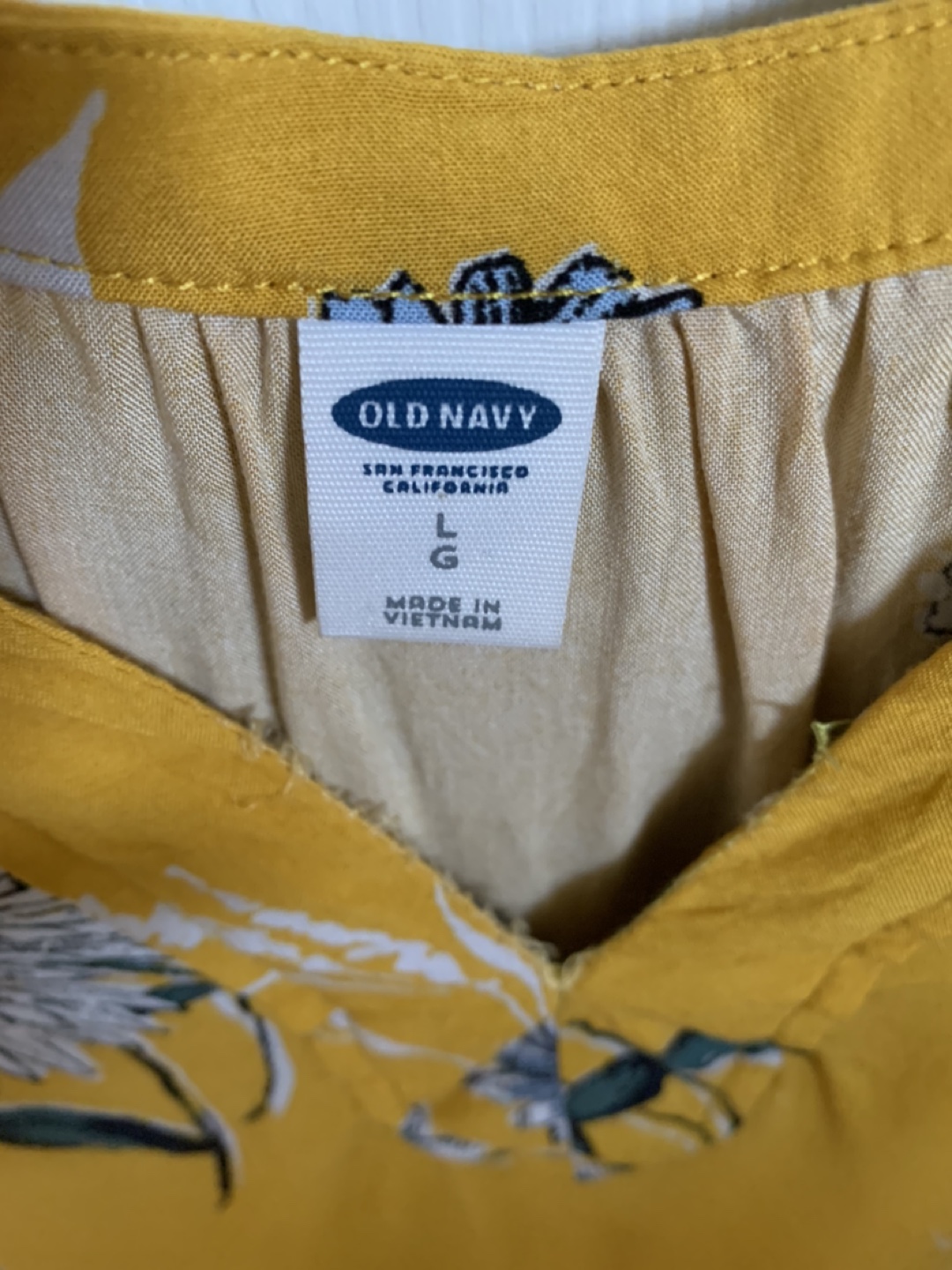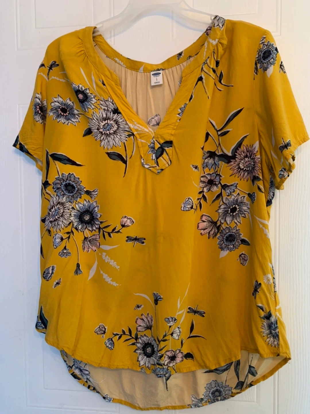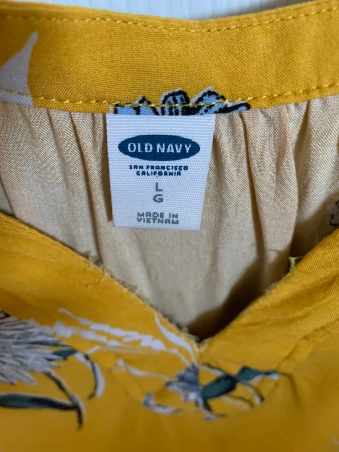 Hi there, I’m selling a gently used lovely large sized yellow old navy blouse. Final sale, non refundable. Cash only, Msg me if interested.
