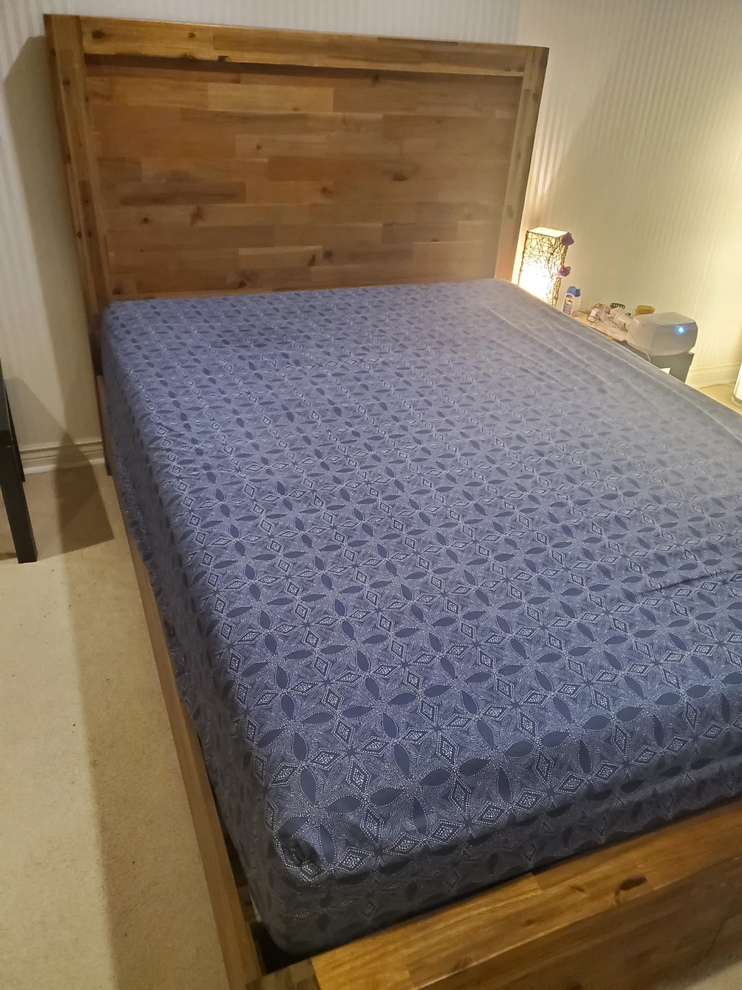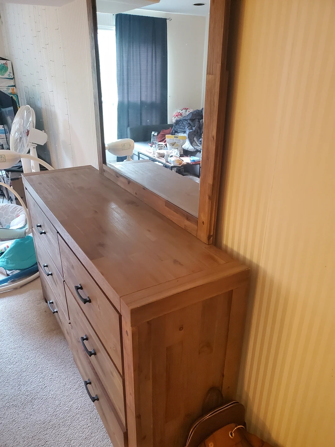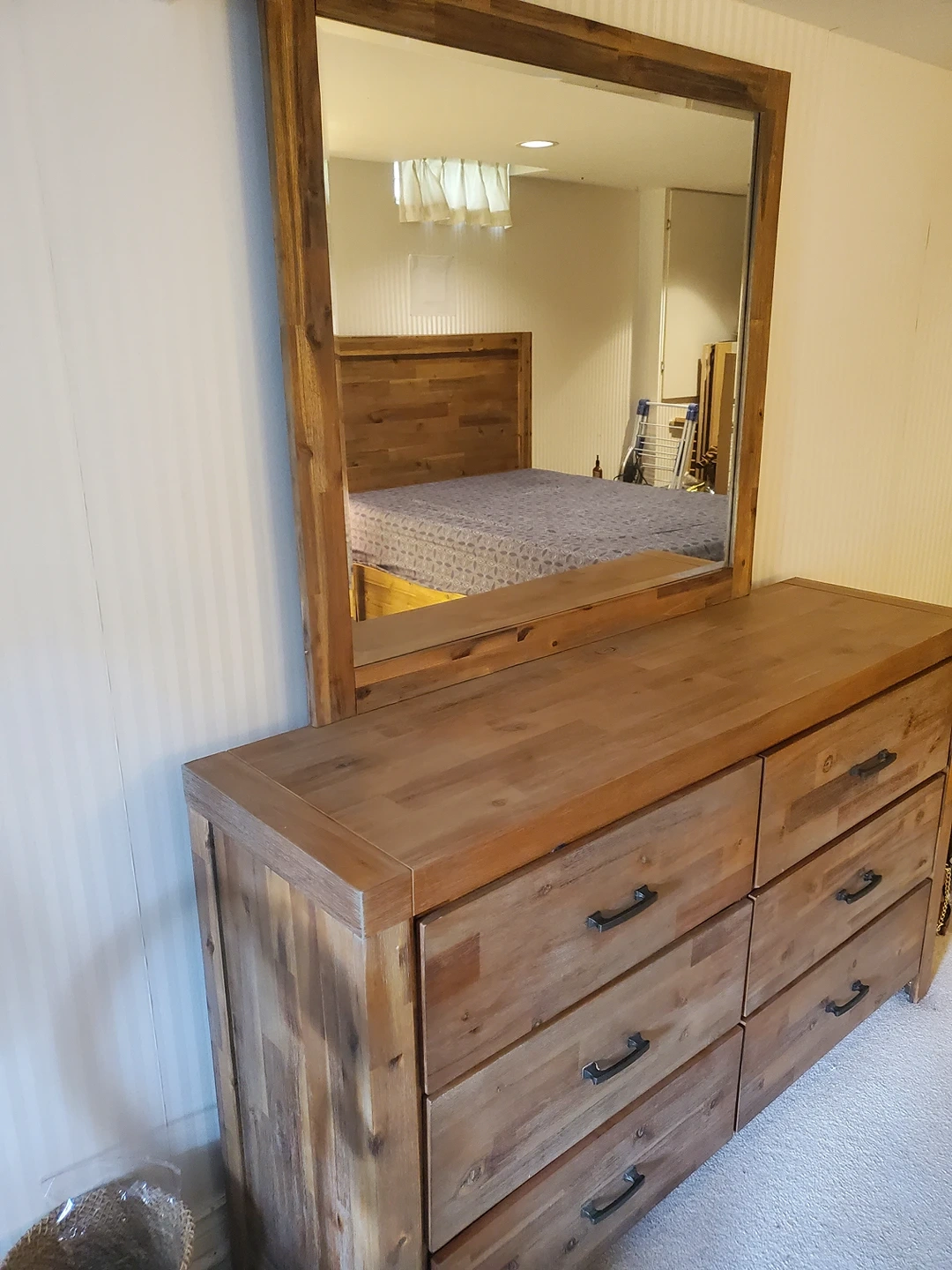 A gently used queen bedroom set, including the full bed with storage, dresser and mirror, mattress isn't included. was originally bought at the Brick for $1200, very good quality wood .