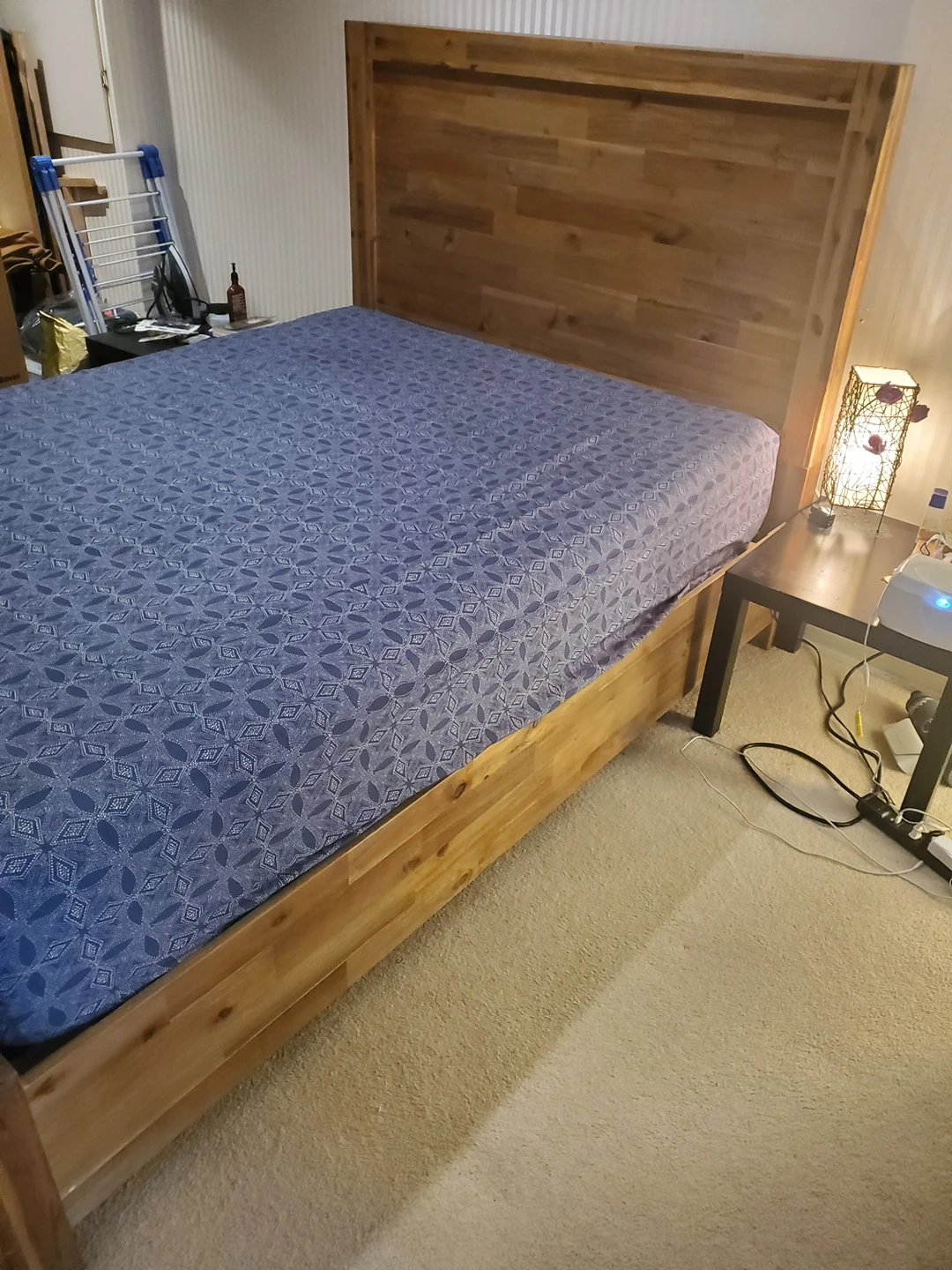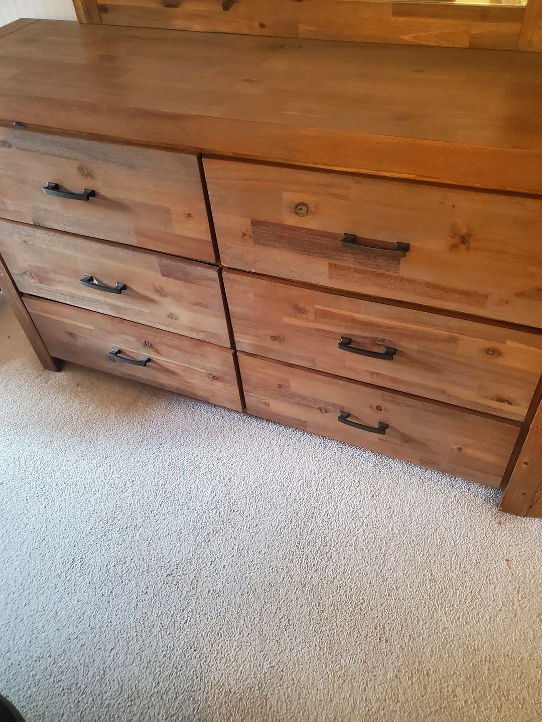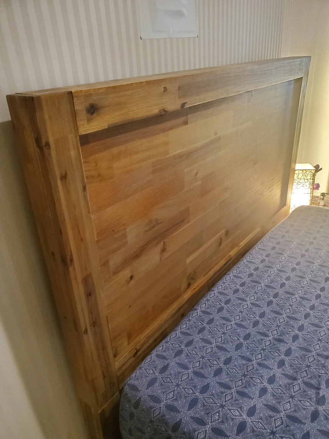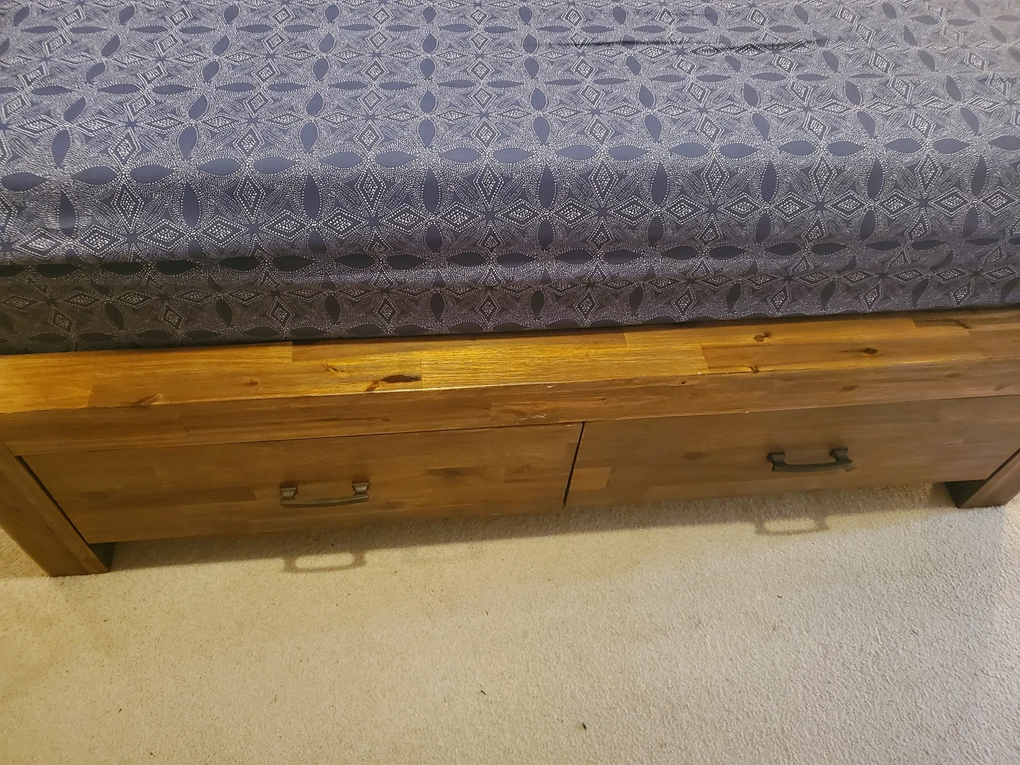 A gently used queen bedroom set, including the full bed with storage, dresser and mirror, mattress isn't included. was originally bought at the Brick for $1200, very good quality wood .