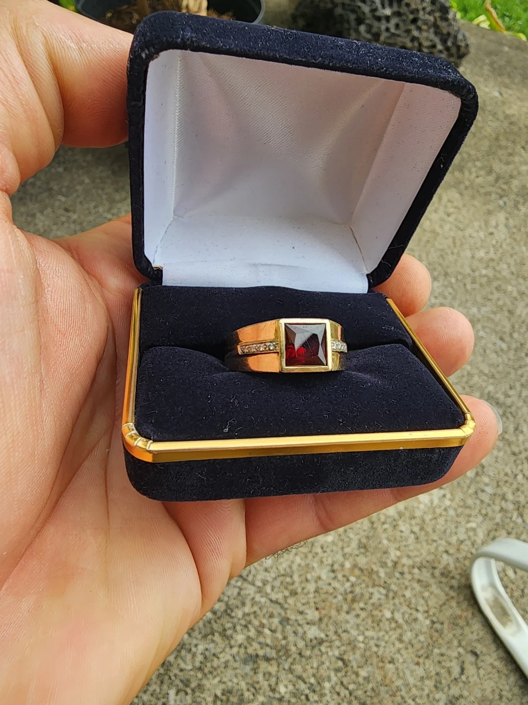 63Men's or Women's Beautiful 10k Gold Solitaire Ring Get that special someone a beautiful 🎁 this year that will last a lifetime! - Material: 10k gold - Size: 10½-10¾ - Top Width: 10mm - Stone: January birthstone (Garnet) w/ 4 natural sparkling diamonds down each sidw - Price: $1,000 This stunning solitaire ring exudes sophistication and style, featuring a beautiful January birthstone and 8 diamonds set in 10k gold. Perfect for special occasions or everyday wear.