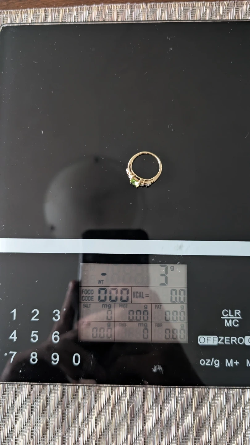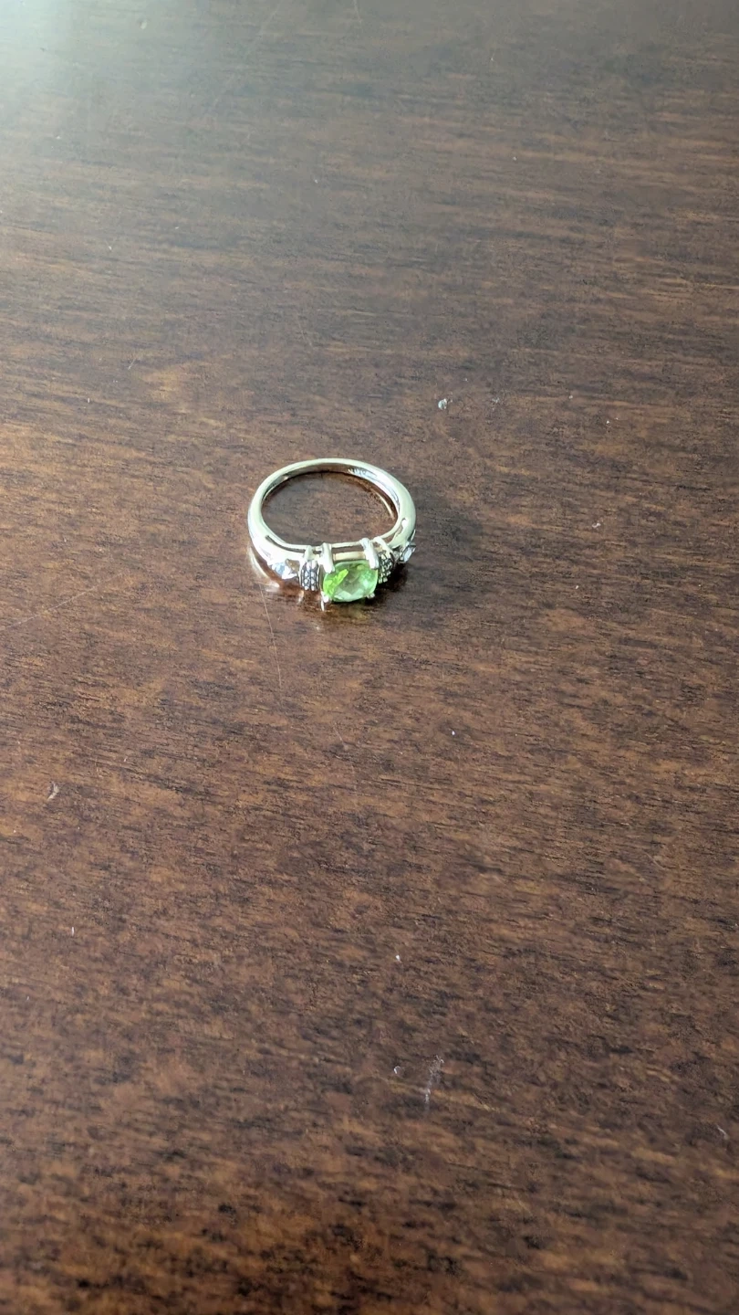 3410k solid gold ring with a green peridot center stone and two small diamond accents. Works nicely as a pinky ring. Bright stone and polished appearance. Details: • Gold Purity: 10k • Weight: ~3g • Stones: Peridot + 2 small diamonds • Condition: Very good • Cash Only • Pickup Only (near North York, Toronto)