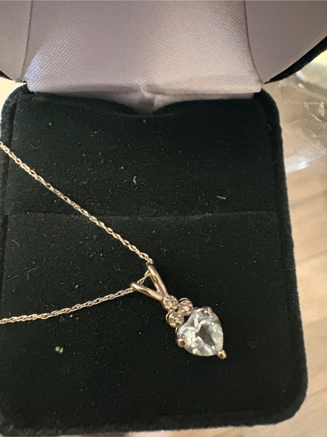 8410K solid necklace with big genuine Aqua stones Here is a lovely heart pendant necklace, perfect for adding a touch of sparkle to any outfit! It comes in a box, ready to be gifted or kept safe. The necklace appears to be in good condition and is ready for a new home