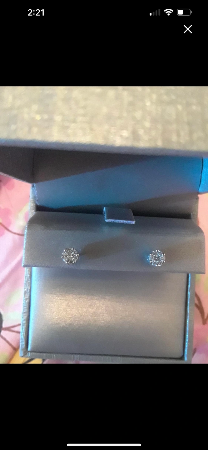 These earrings feature a cluster of small genuine diamonds in a round setting on 10k white gold. They are simple and elegant. Brand new, unworn. Retails for over $400