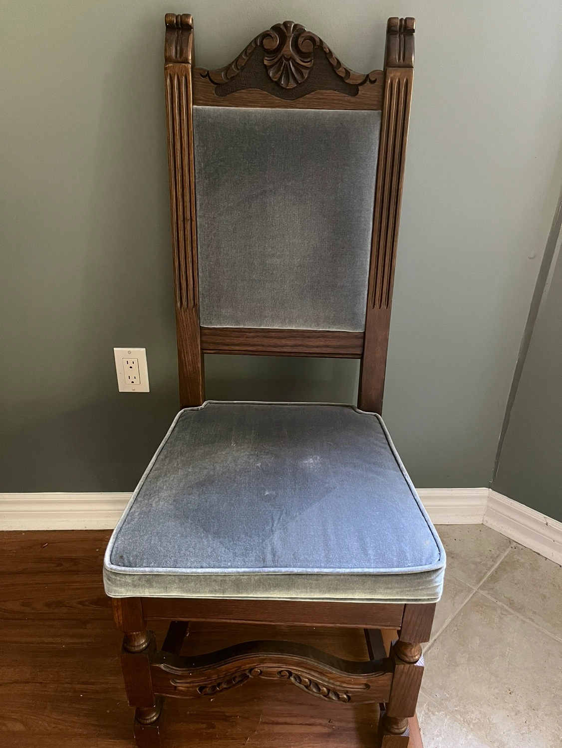 This hardwood dining chair features a sturdy wooden frame and a padded seat and back. 10 chairs available and $50 each.