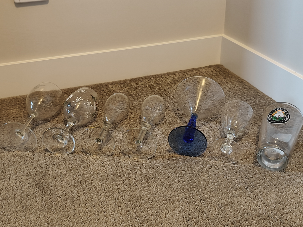I am selling 3 Wine, 2 Champagne, 1 Cocktail Martini, and 1 Beer Stein Mug Bar Glasses in excellent condition. No chips or cracks in any of the glasses.