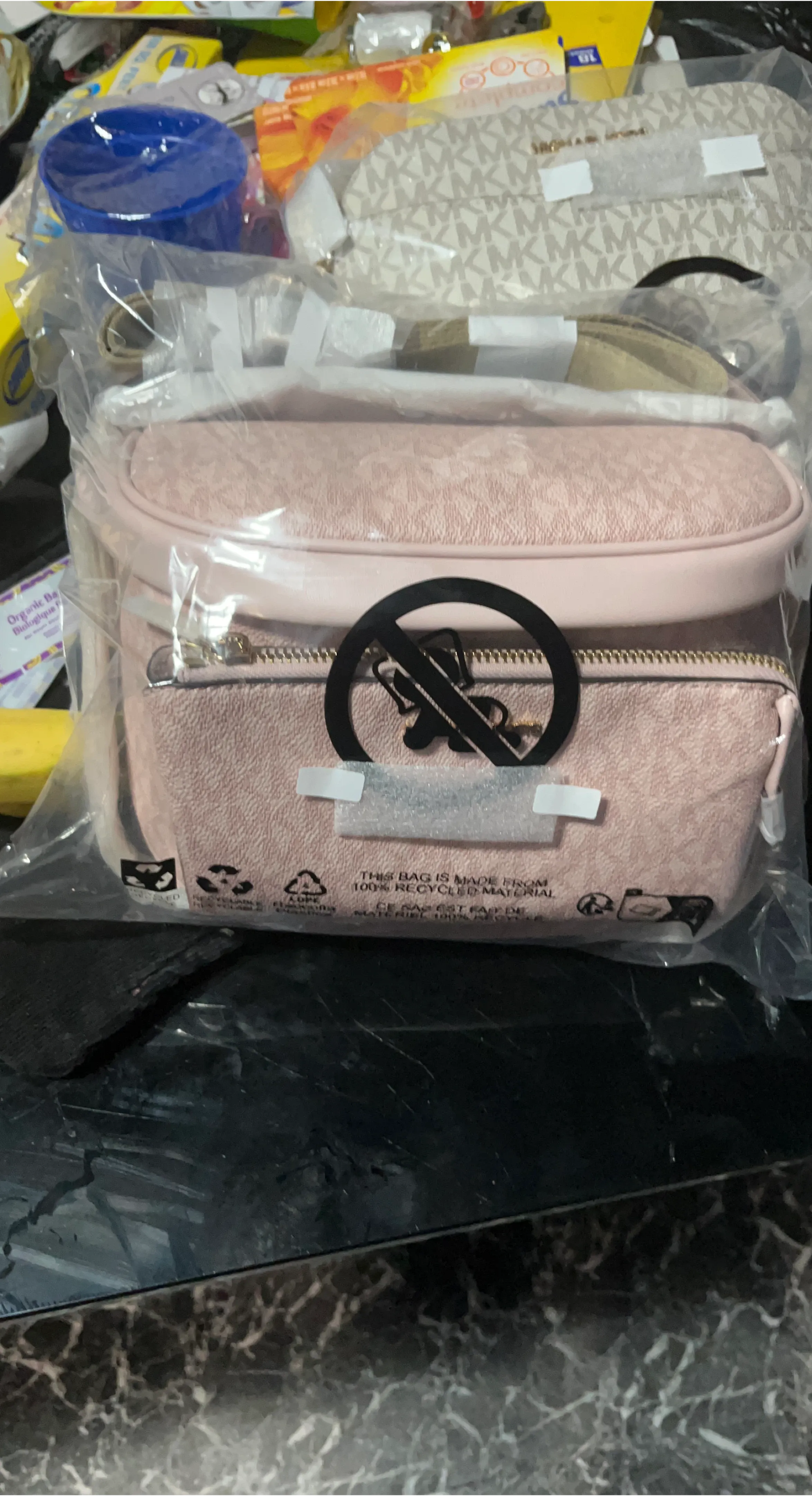 This is a Michael Kors belt bag in pink with the signature MK logo pattern. It's made from 100% recycled material. The bag features a zippered main compartment and an additional front zippered pocket.