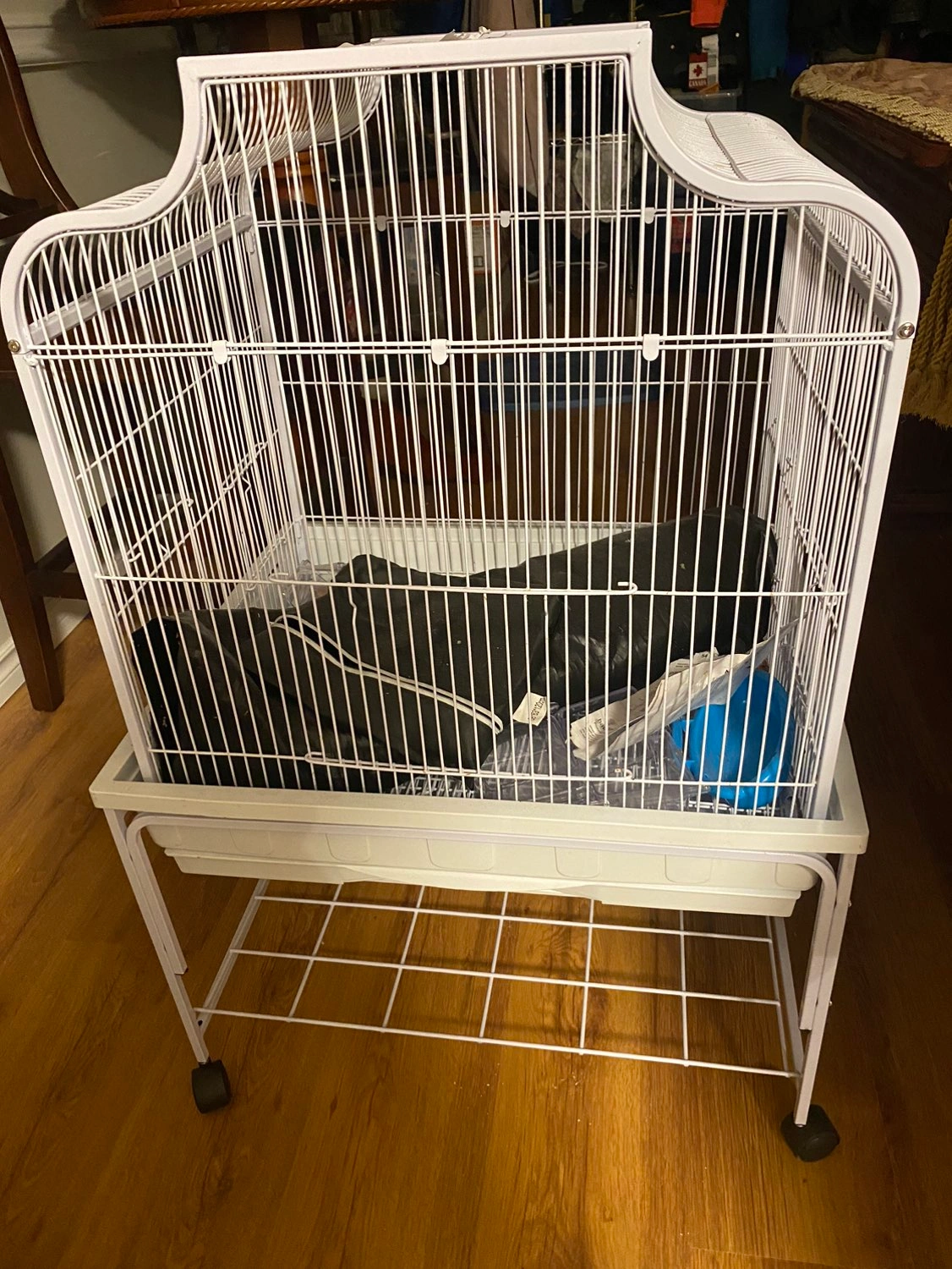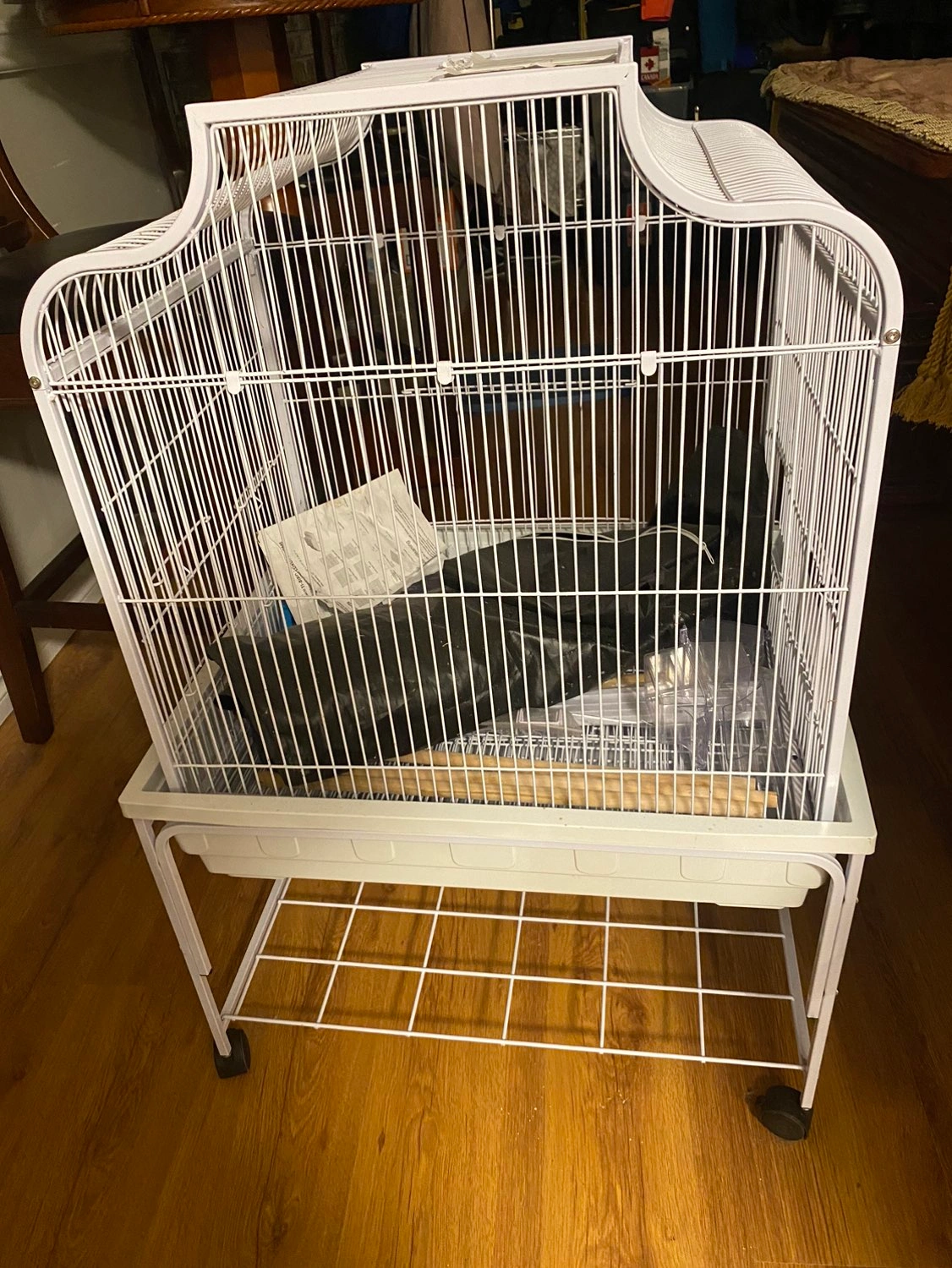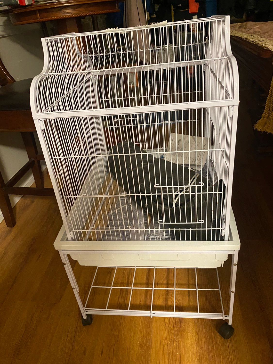 Habitat Dimensions: 25” L X 21” W X 54.5” H. 4 covered food and water cups. Crossbar and 10 perches. Storage rack, easy slide up door on front for interaction with birds. Black cage cove. Easy clean pull out drawer. Cage is on wheels. Quick disassemble/assemble. Instruction manual included.