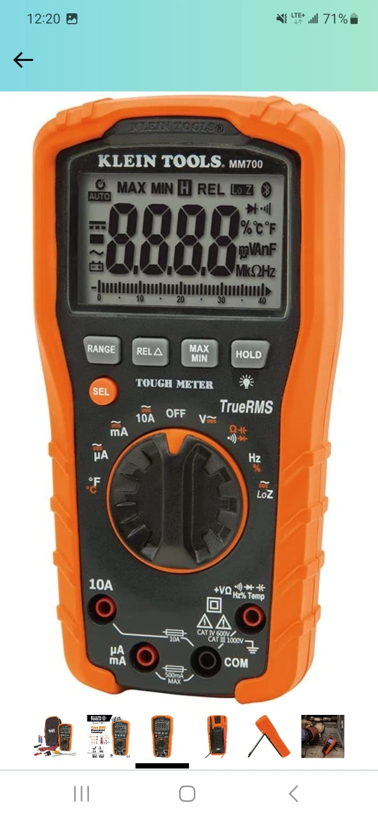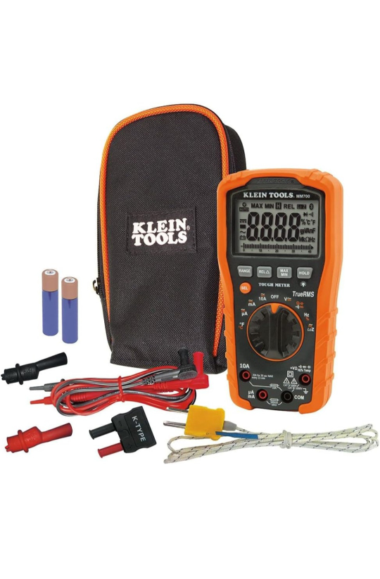 15BRAND NEW KLEIN TOOLS MM700 DIGITAL MULTIMETER ASKING $150 OR BEST OFFER Klein Tools Multimeter with automatic ranging true root mean square (TRMS) technology for increased accuracy Tester measures up to 1000V AC/DC voltage, 10A AC/DC current and 40MOhms resistance plus temperature, capacitance, frequency, duty-cycle, test diodes and continuity CAT IV 600V Safety Rating Built to withstand a 6.6-foot (2m) drop and withstand daily wear and tear on the job site Low Impedance (LoZ) mode for identifying and eliminating ghost or stray voltages For use in basic and controlled electromagnetic environments such as residential, business and light-industrial locations Low battery indicator and easily accessible battery and fuse replacement compartment Includes carrying pouch, test leads, alligator clips, thermocouple with adapter and batteries Drop Protection: 6.6' (2 m) Display: 4000 Count LCD Functions: Measures up to 1000V AC/DC voltage, 10A AC/DC current and 40MΩ resistance plus temperature, capacitance, frequency, duty