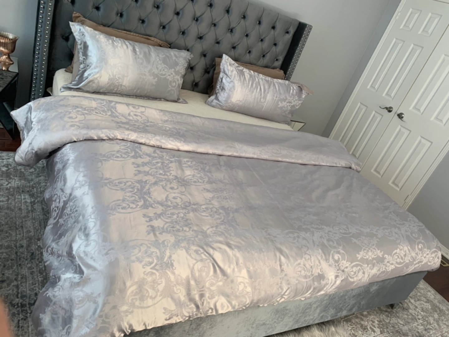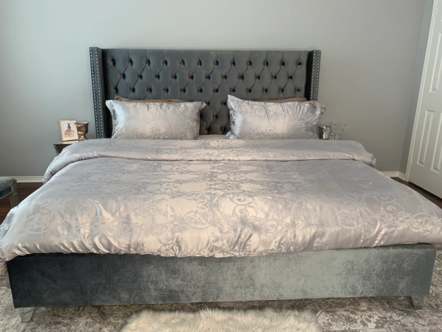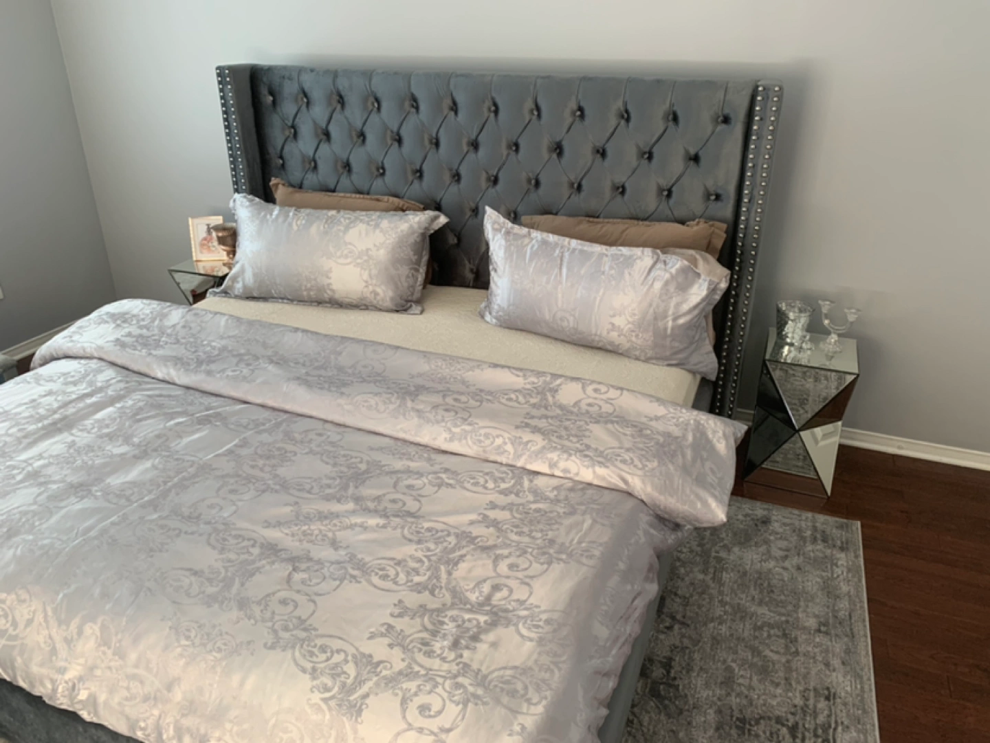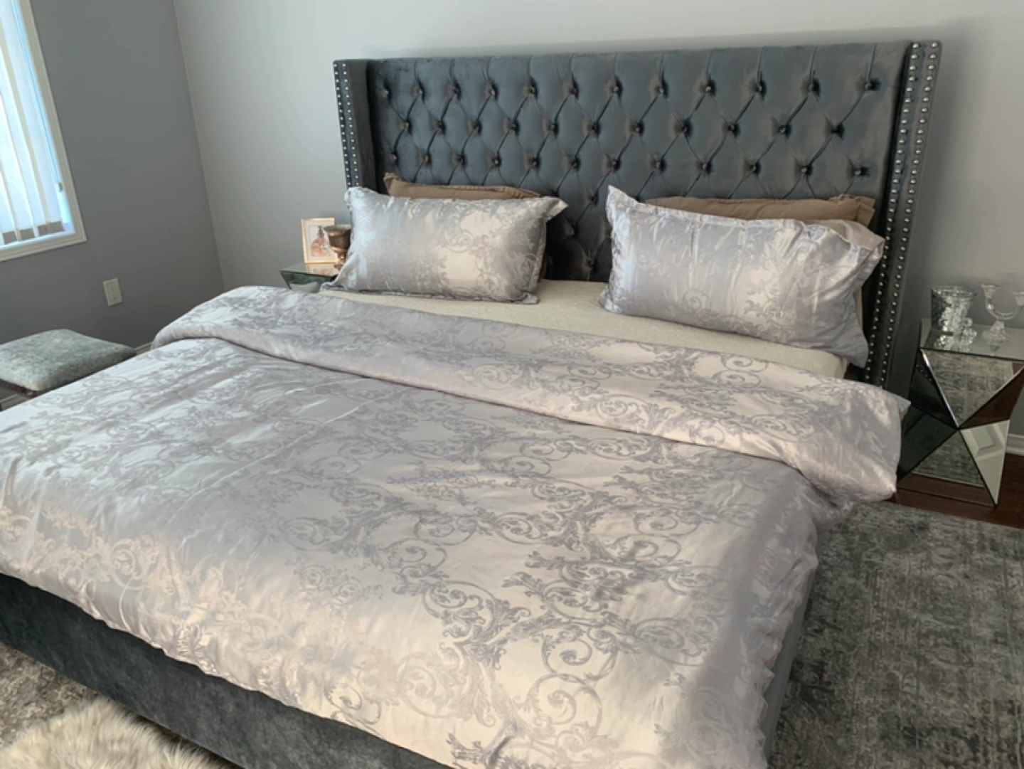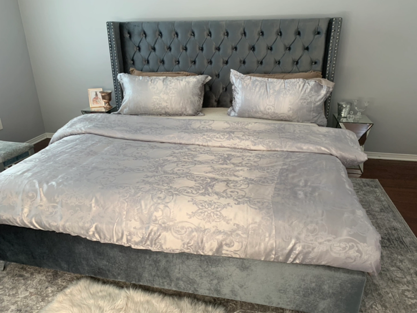 Reason for selling, I have my eye on a new light silver upholstered bed. The bed is spectacular, but to my disappointment, this bed is little dark greyish silver, not light silver, which I originally wanted on wayfair. But, the bed is beautiful and sturdy. It is crafted from solid wood, its square silhouette is augmented by wingback-inspired wings for a bold look, while button-tufted accents and lines of nailhead trim rope in a little bit of contemporary charm. Velvet upholstery adds yet another textural touch.
