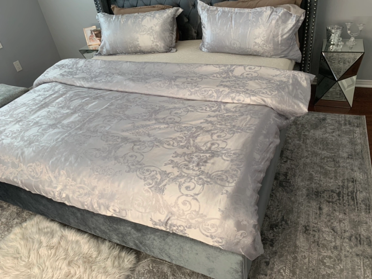 Reason for selling, I have my eye on a new light silver upholstered bed. The bed is spectacular, but to my disappointment, this bed is little dark greyish silver, not light silver, which I originally wanted on wayfair. But, the bed is beautiful and sturdy. It is crafted from solid wood, its square silhouette is augmented by wingback-inspired wings for a bold look, while button-tufted accents and lines of nailhead trim rope in a little bit of contemporary charm. Velvet upholstery adds yet another textural touch.