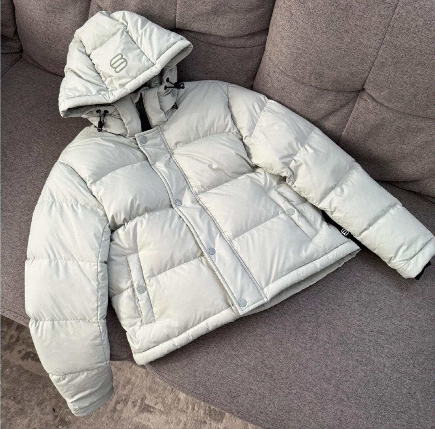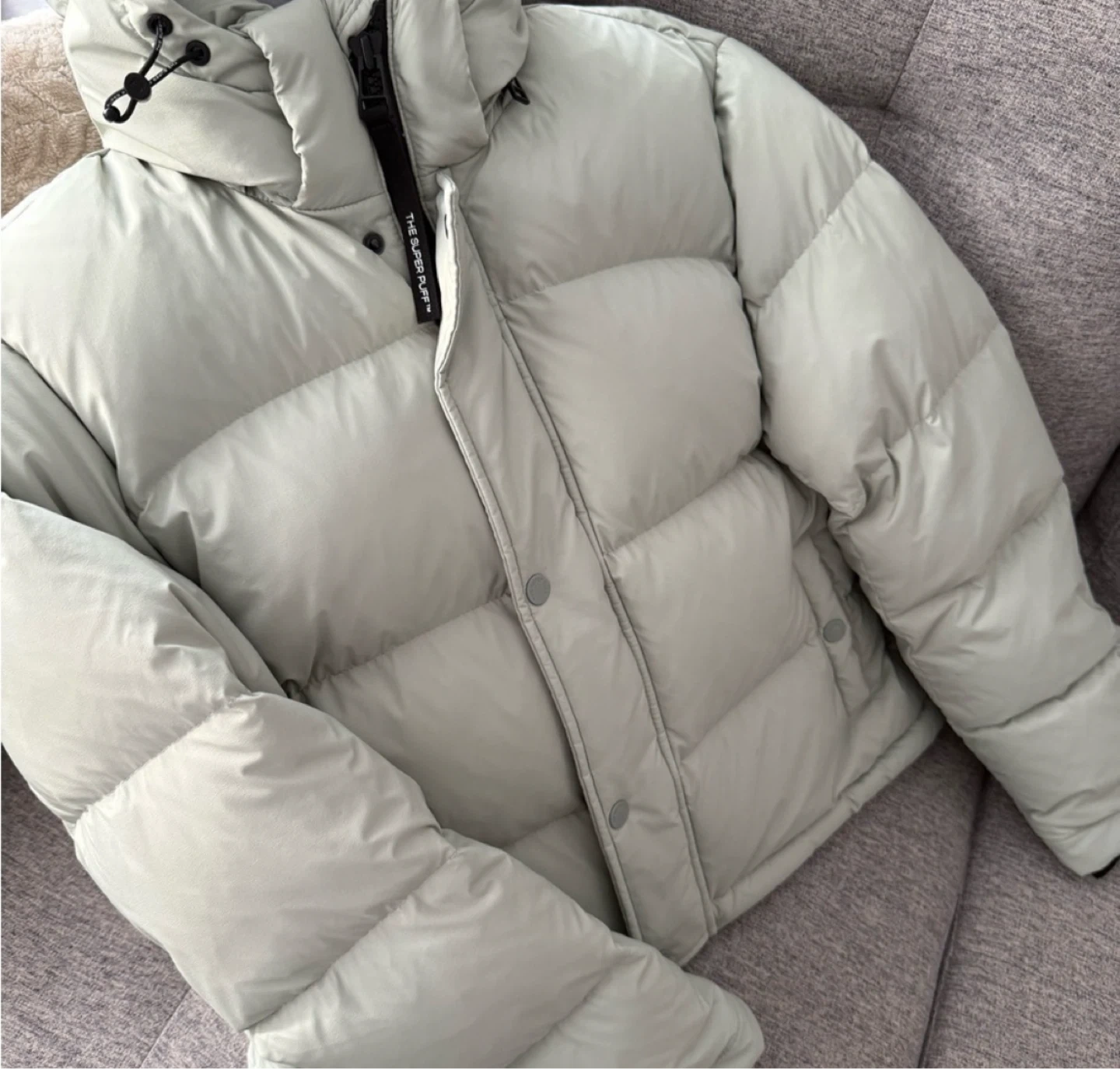 Selling my Aritzia Super Puff Shorty in size XS, color Dusky Green (stock photo added for color reference β shade appears slightly lighter in person).