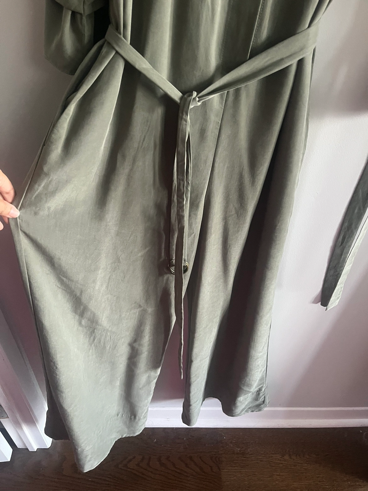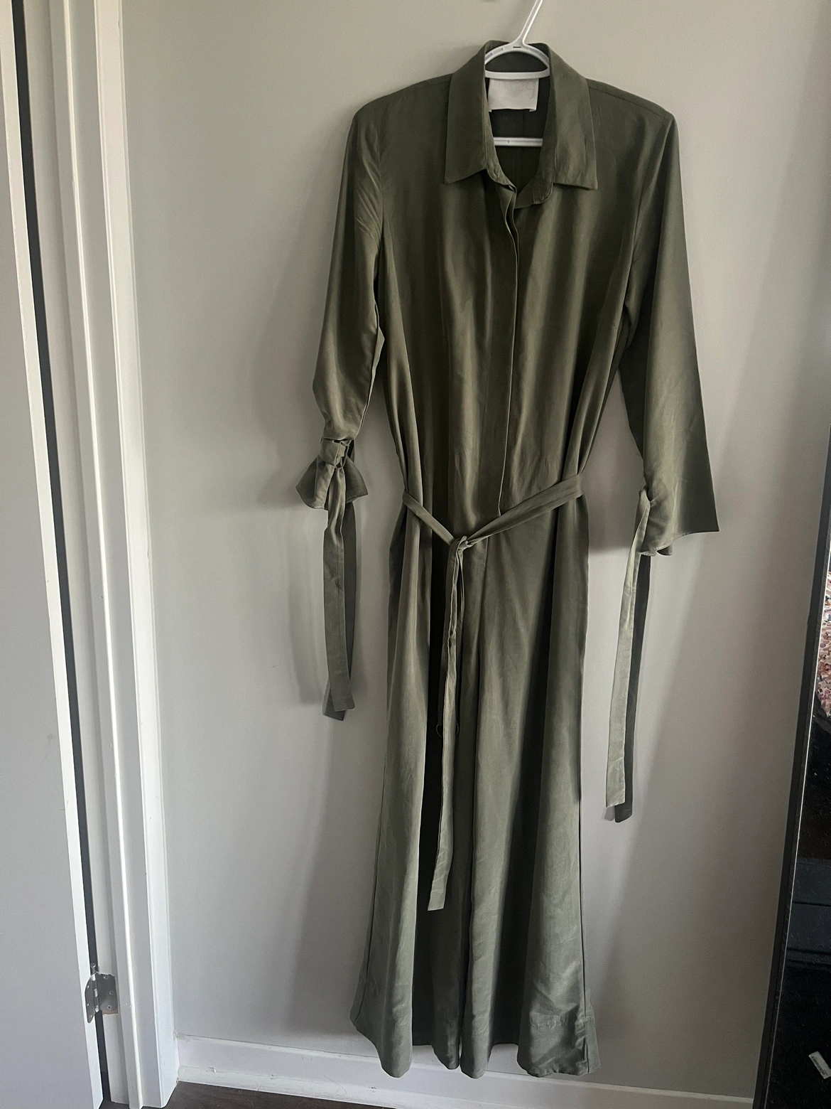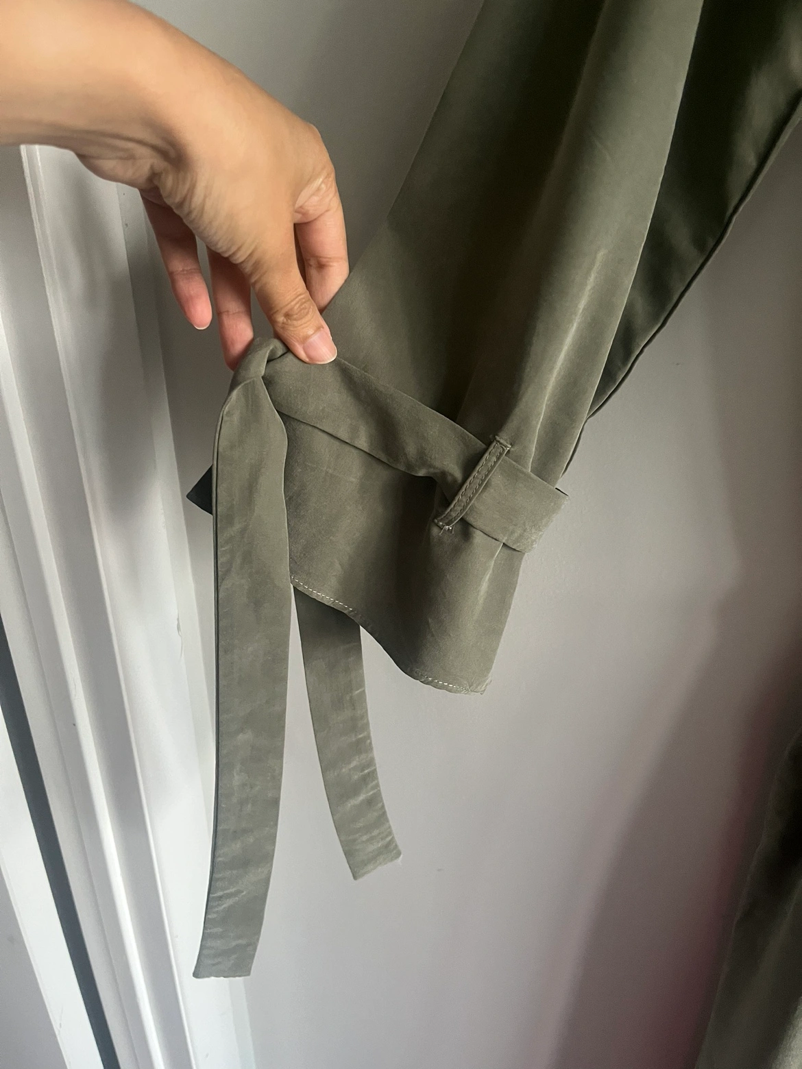 Beautiful olive colour jumpsuit that comfortable and flowy. Wide leg pant. Tie details on the sleeves. Buttons down the front. Comes with a belt.