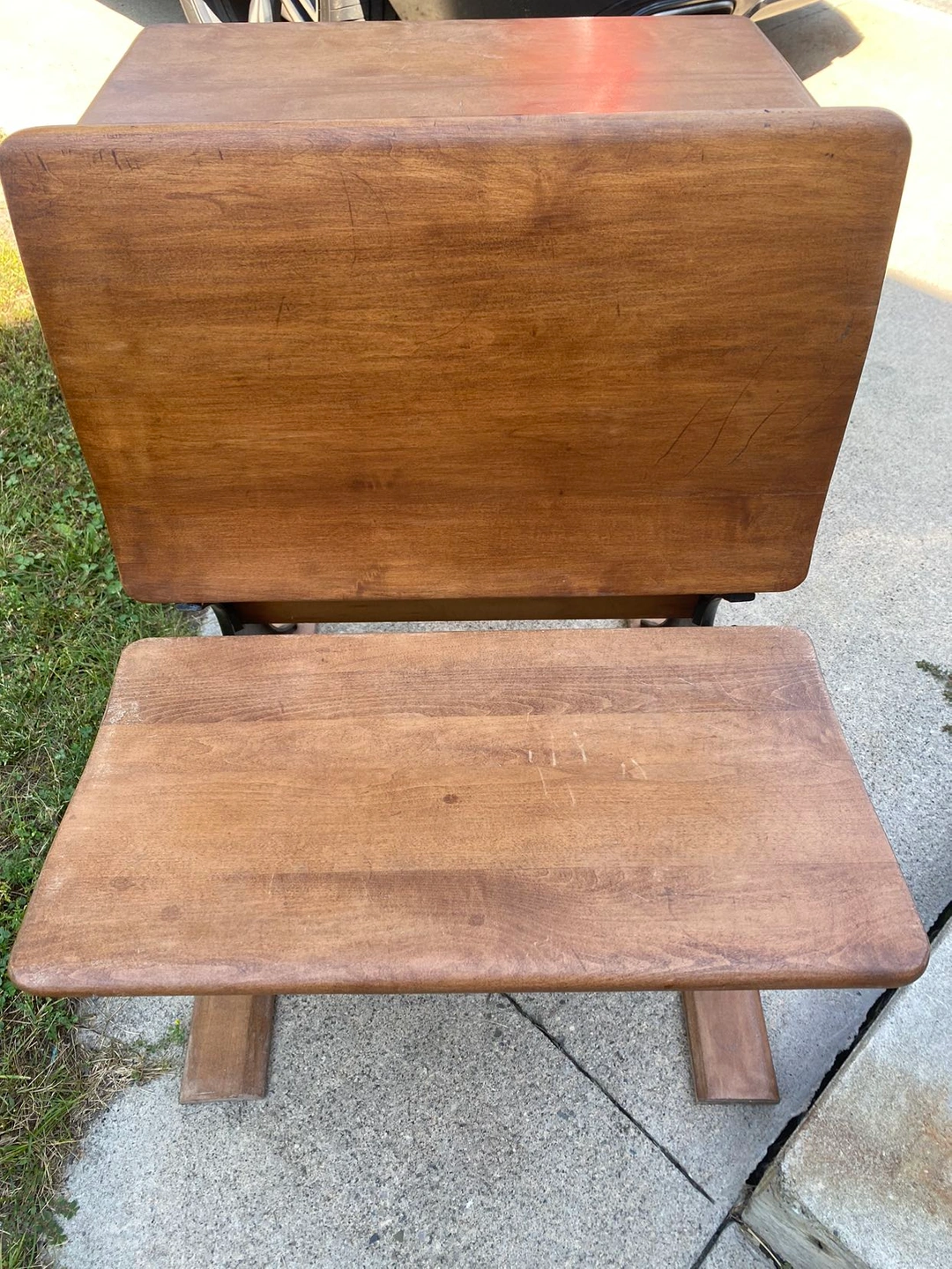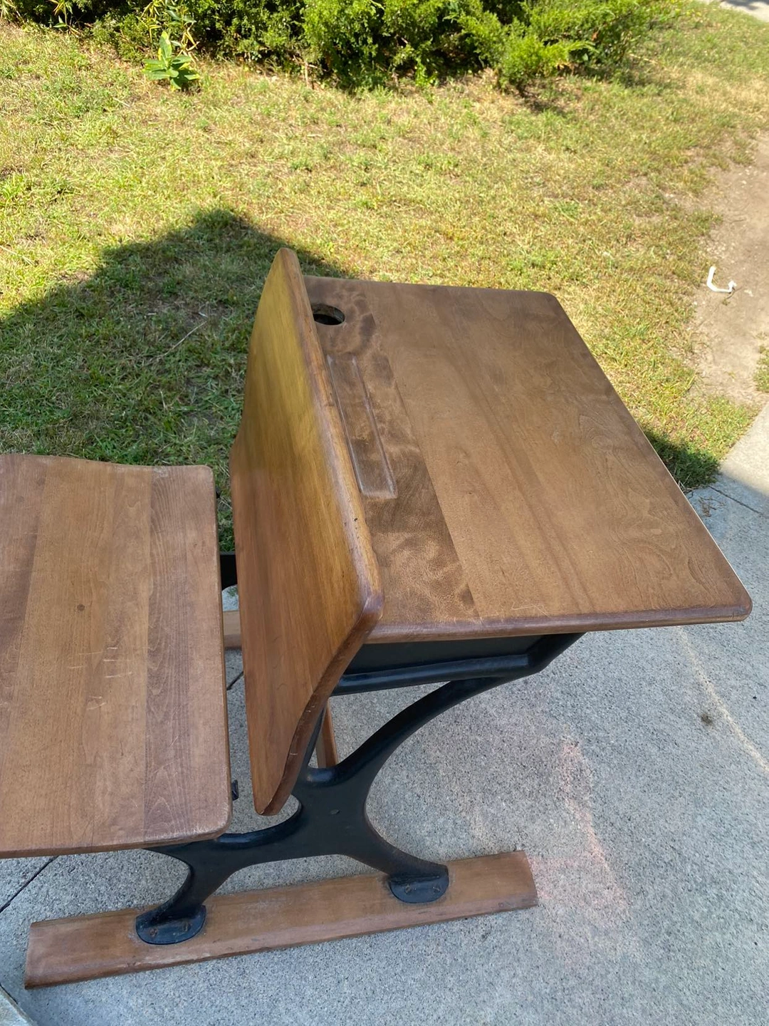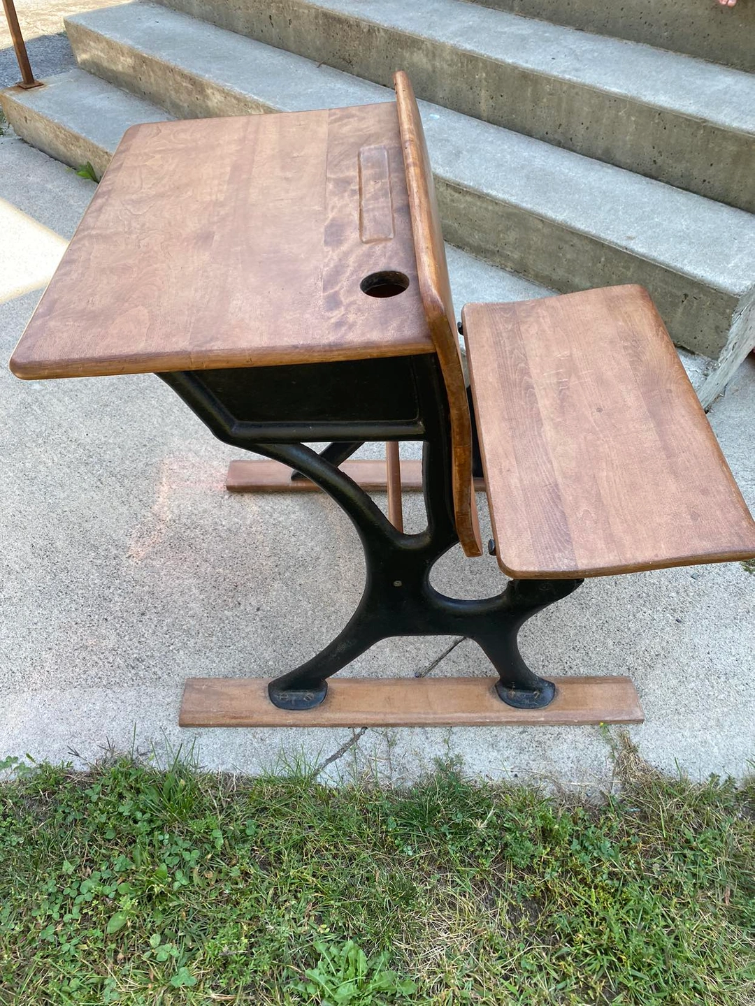 Old school desk with inkwell hole and fold up seat. This desk is in very good condition aside from a few markings made by school children when the desk was in use.