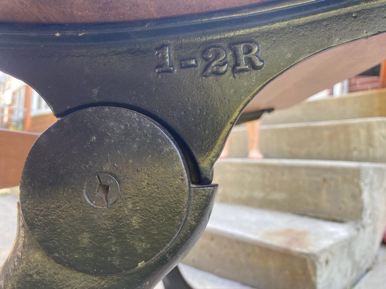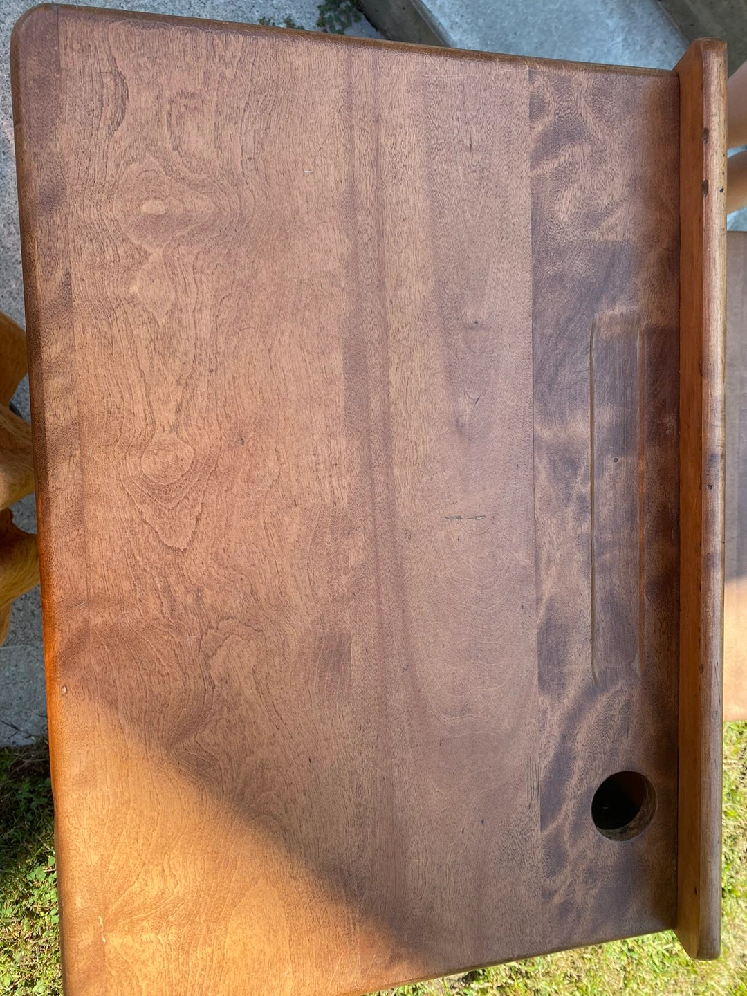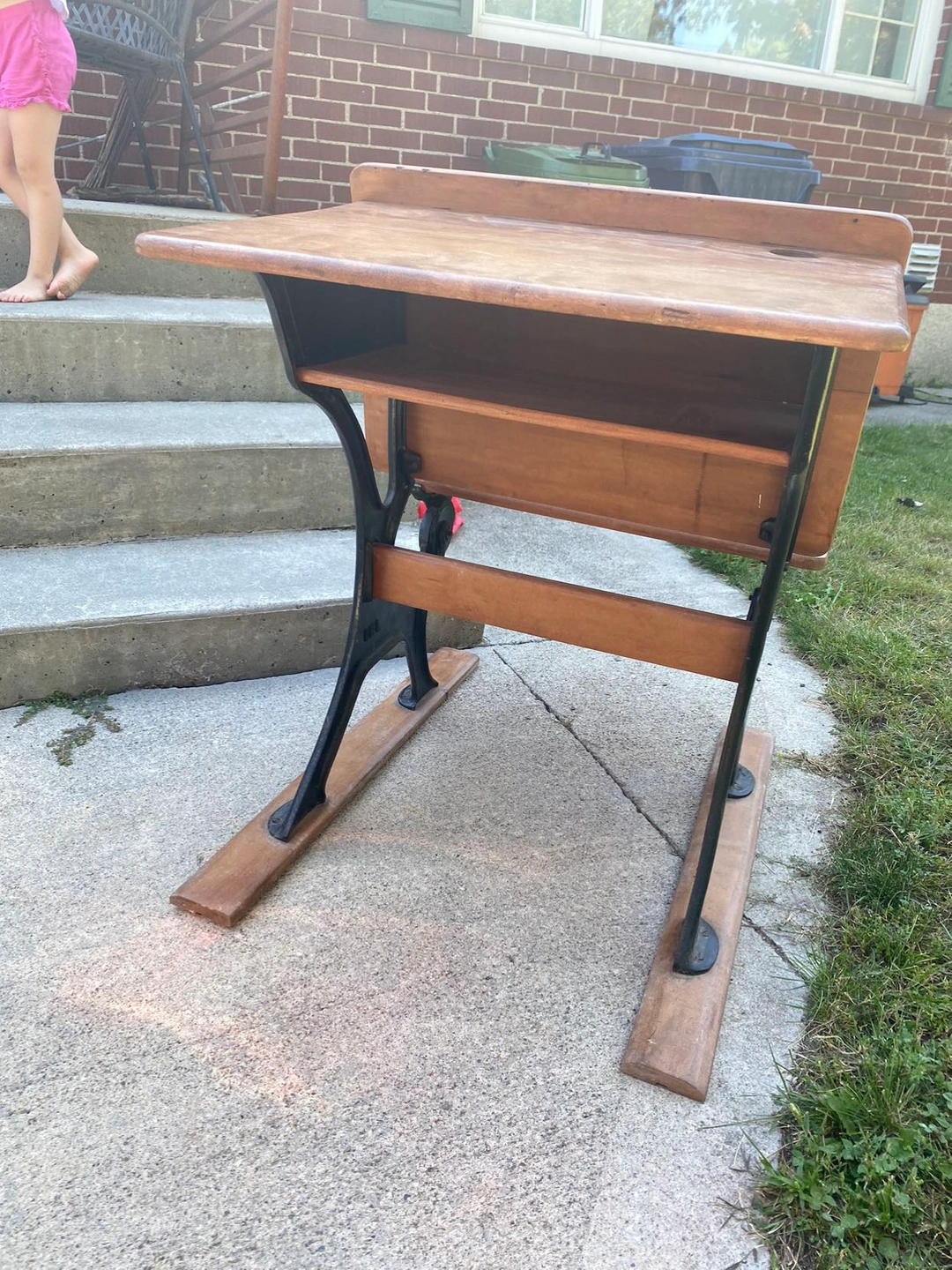 Old school desk with inkwell hole and fold up seat. This desk is in very good condition aside from a few markings made by school children when the desk was in use.