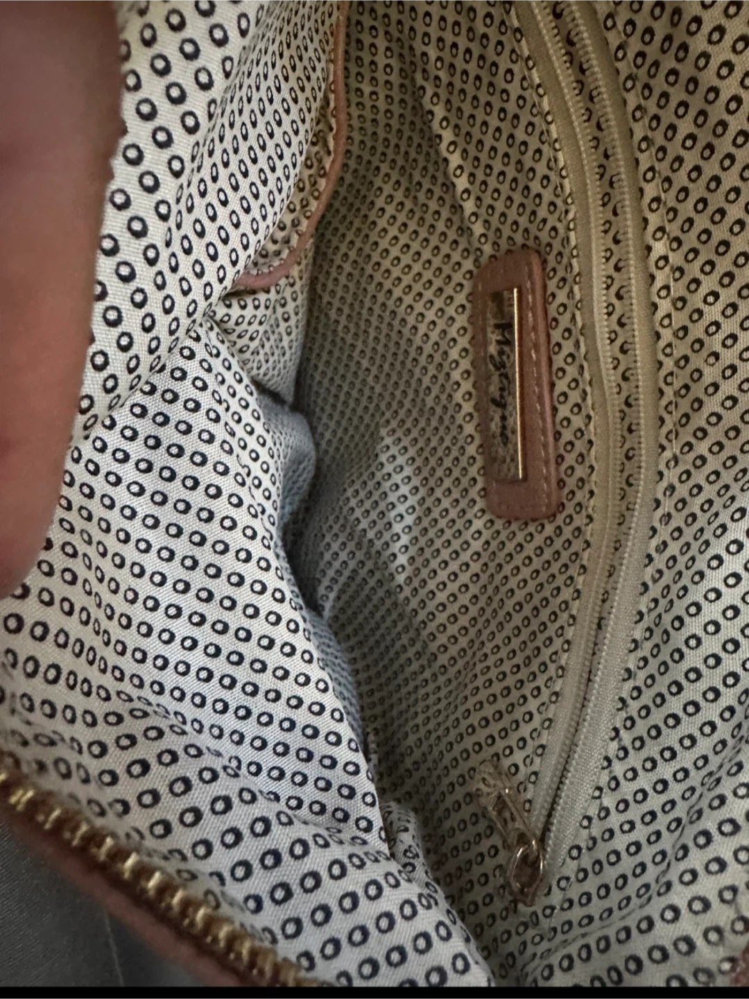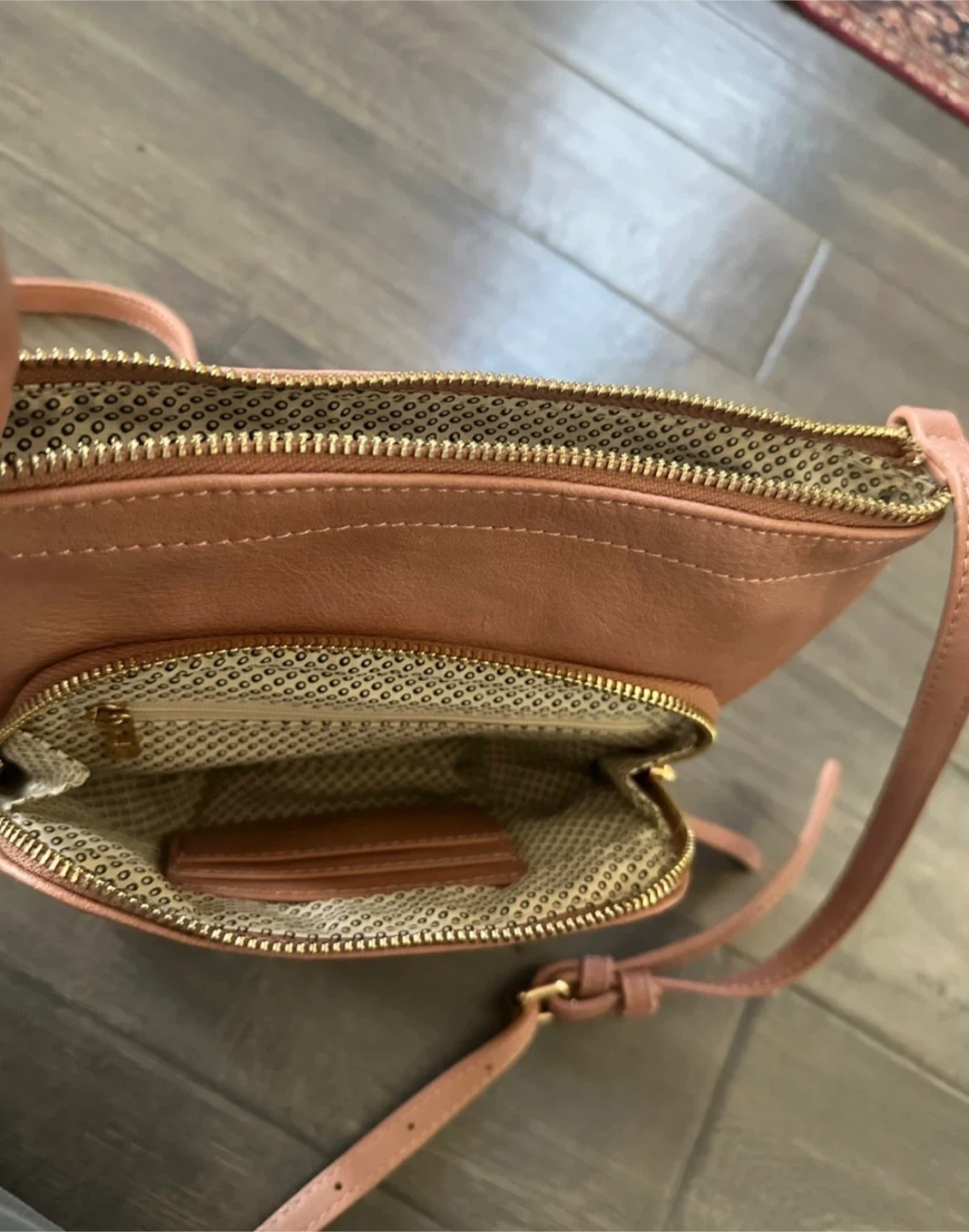 Cute pink crossbody purse with gold accents. It has a main zippered compartment and an additional front pocket. The interior lining has a fun patterned design.