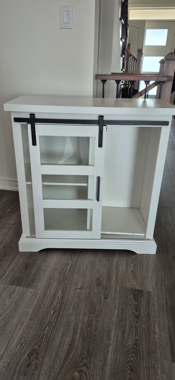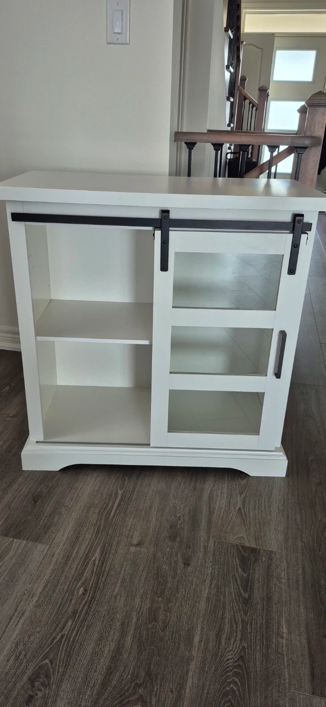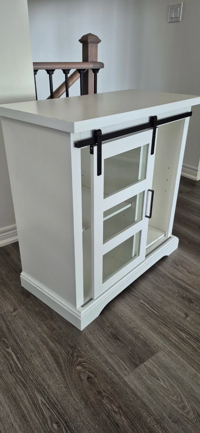 This white cabinet features sliding barn doors with glass panes, perfect for displaying items. It has three interior shelves on one side and an open storage area on the other with optional division. It's a stylish piece for any room!