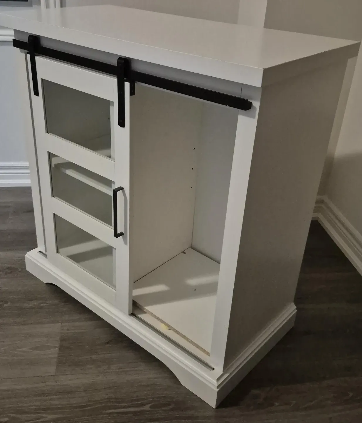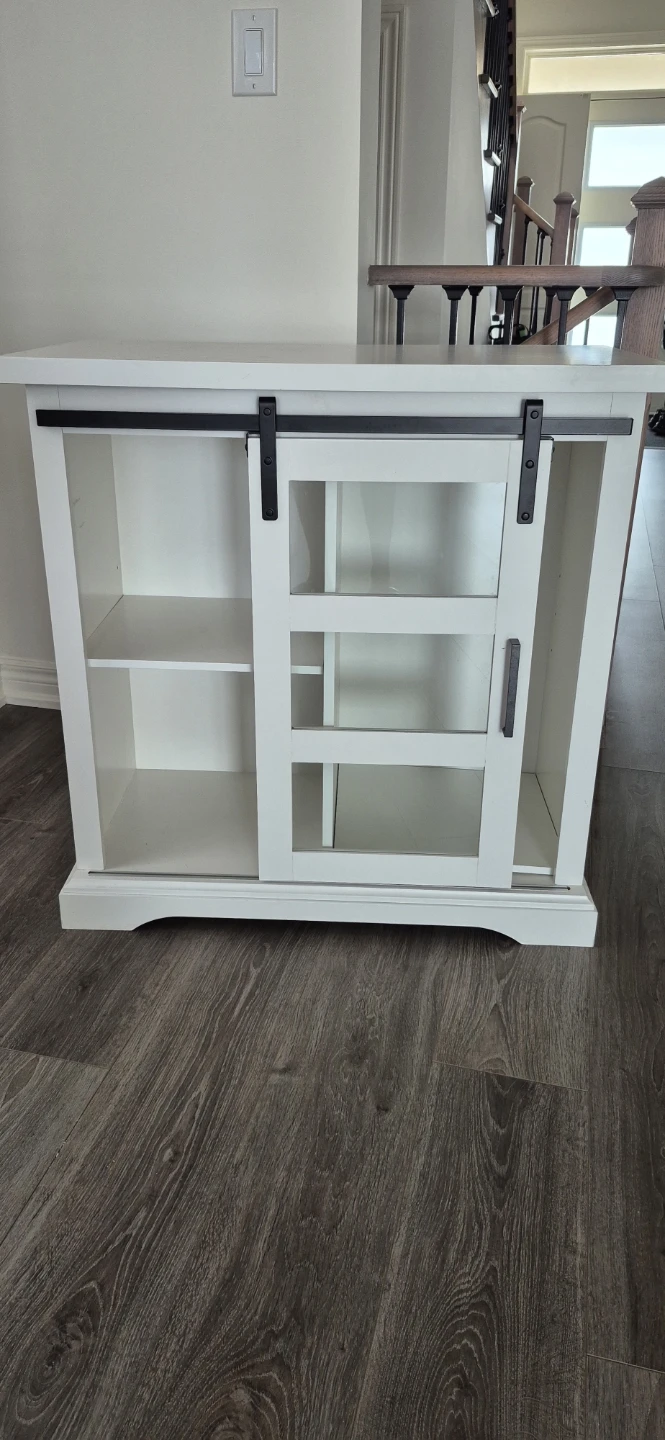 This white cabinet features sliding barn doors with glass panes, perfect for displaying items. It has three interior shelves on one side and an open storage area on the other with optional division. It's a stylish piece for any room!