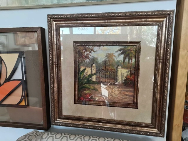 This is a framed piece of art that would look amazing in any room! It is in good condition, and ready to be hung up on the wall. Beautiful court yard theme. * Frame Dimensions: 24" x 24" * Art Dimensions: 12" x 12" If the ad's still up, the art is still available; pu showroom in chinook mall area