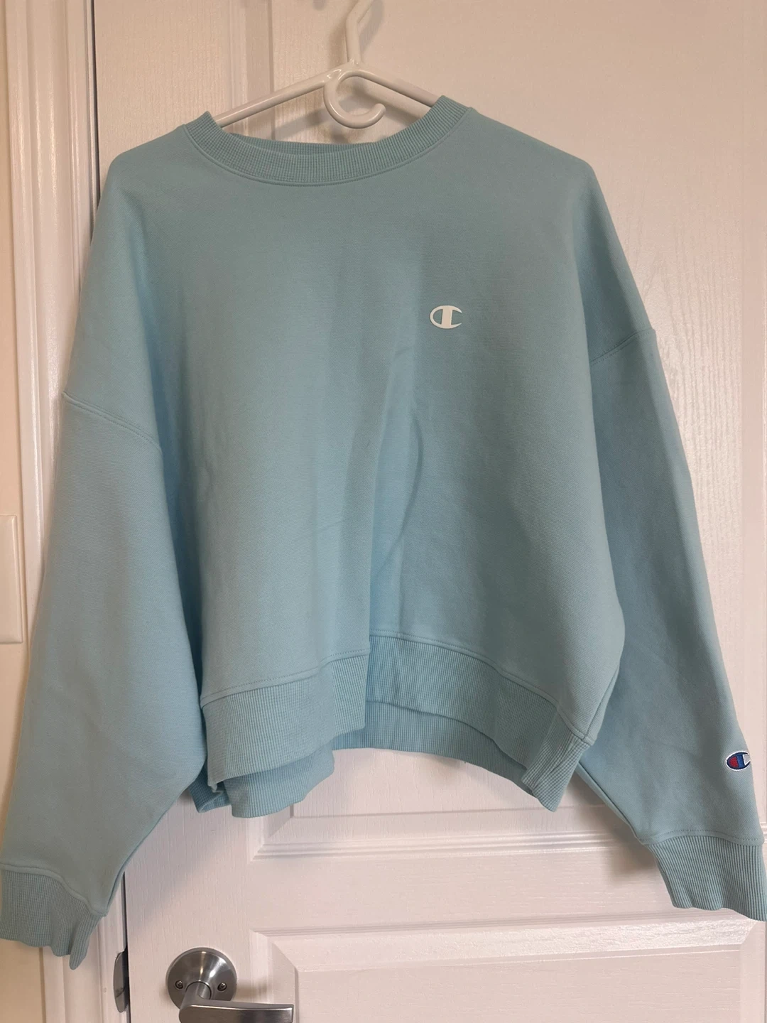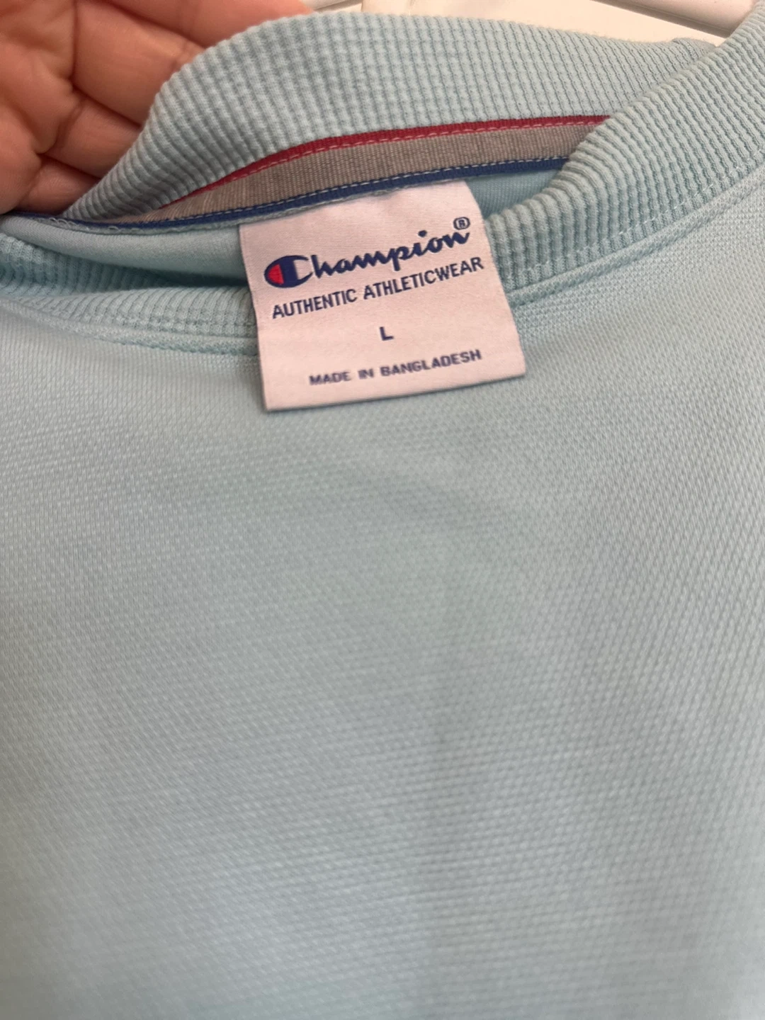 Light blue Champion Authentic Athleticwear sweatshirt. It's a size large with the signature "C" logo on the chest and sleeve. Ribbed cuffs and hem. Made in Bangladesh.