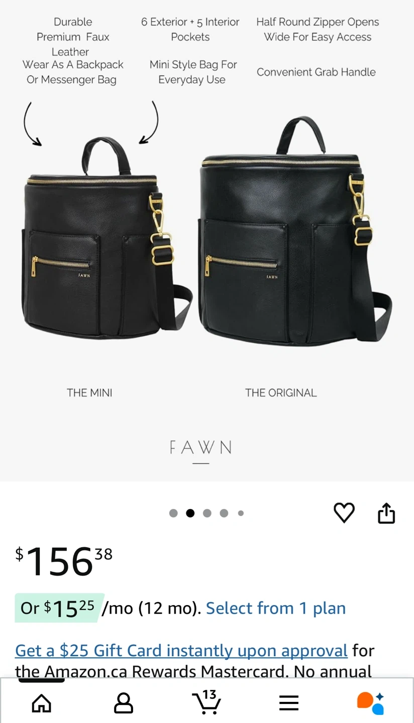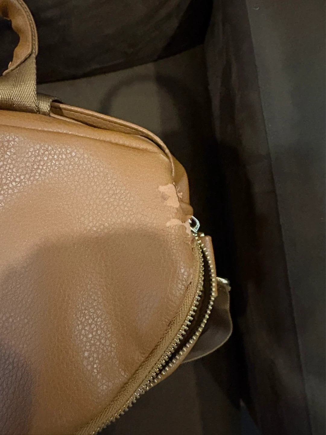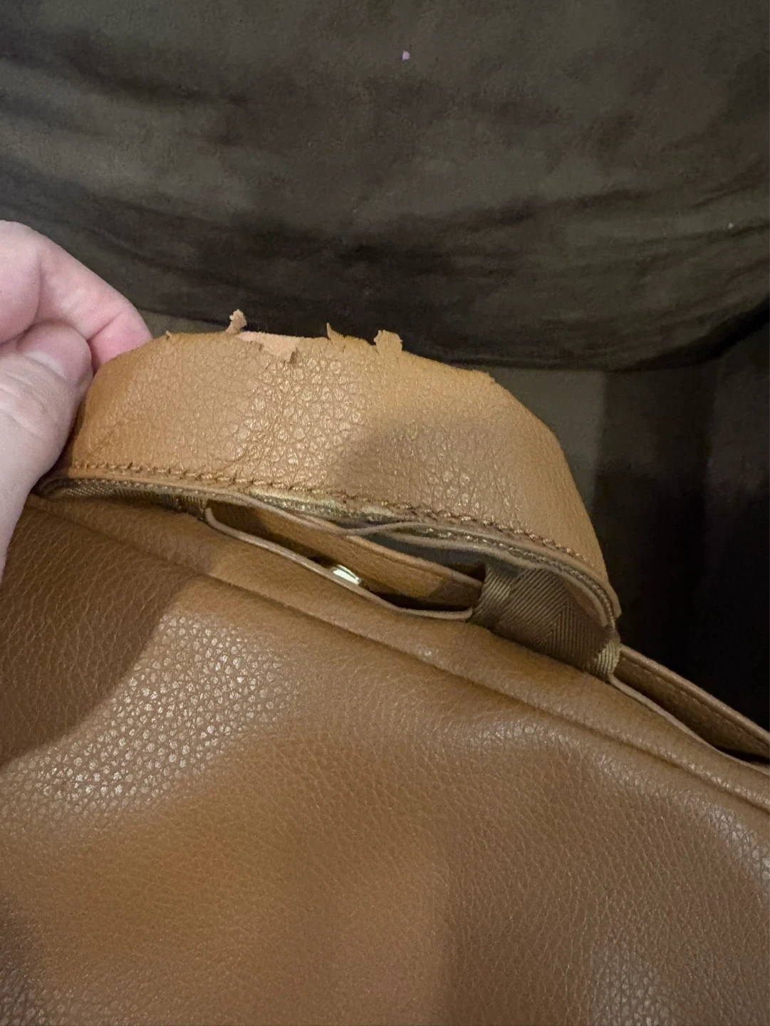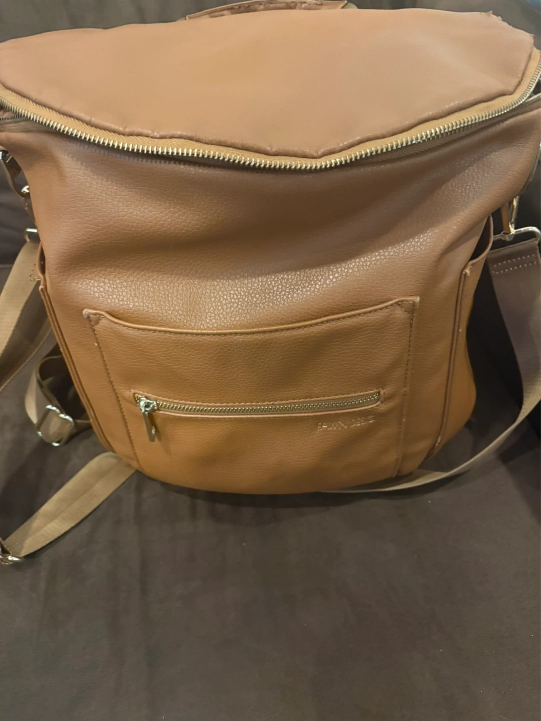 This FAWN Diaper Bag is made from durable faux leather and can be worn as a backpack or messenger bag. It features 6 exterior and 5 interior pockets, plus a half-round zipper for easy access. Some wear and tear is visible on the faux leather edges.