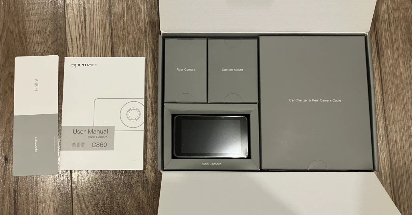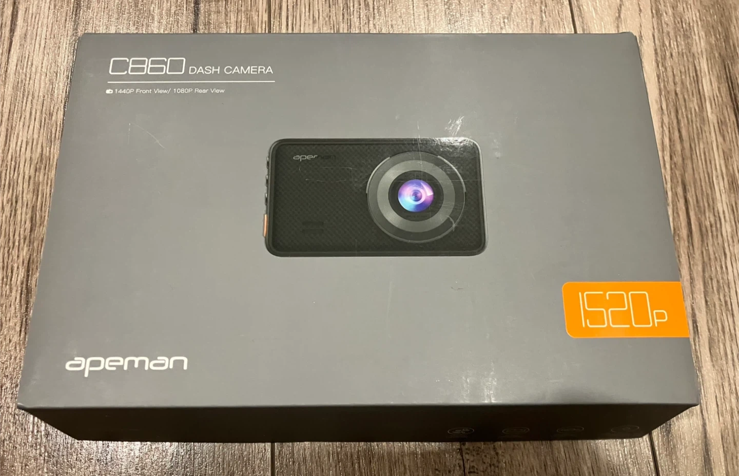 This Apeman C860 dash camera features a 3" IPS screen with a 170° wide-angle lens. It supports 1440p resolution for the front camera and 1080p for the rear camera. It includes G-sensor protection, motion detection, and parking monitoring functions. The package includes the main camera, rear camera, suction mount, and car charger/rear camera cable.
