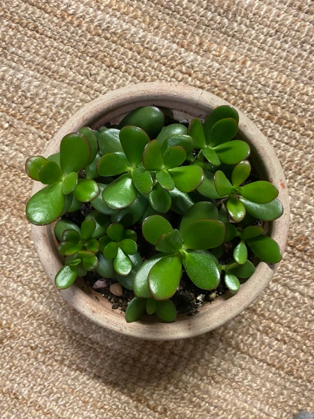 Thriving Jade Plant established and thriving . There are multiple plants in the pot that can be divided into separate plant or continue growing together .