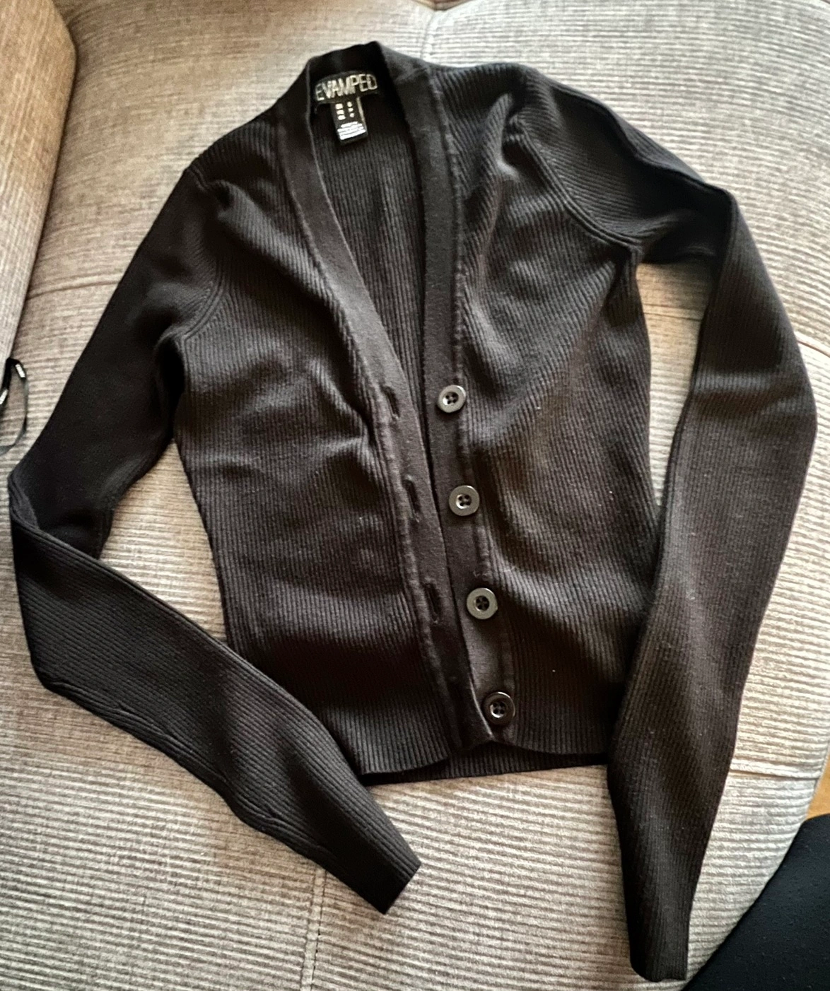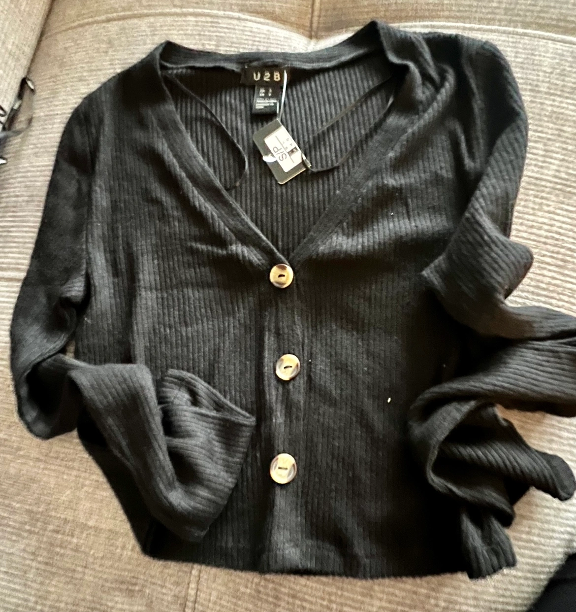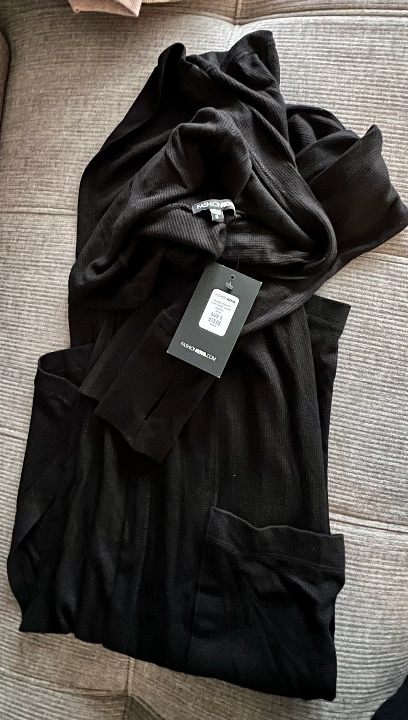 Black with Hoodie Long Cardigan with front pockets and thumb hole on sleeve hem Size Small with tag $35