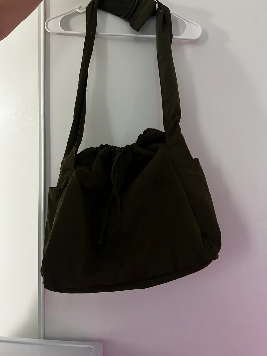 a comfy medium sized olive green shoulder and cross bag! It's perfect for carrying your everyday essentials. The bag features a drawstring closure and handy side pockets. i bought it and never used it so it’s better to give it to a new home :)