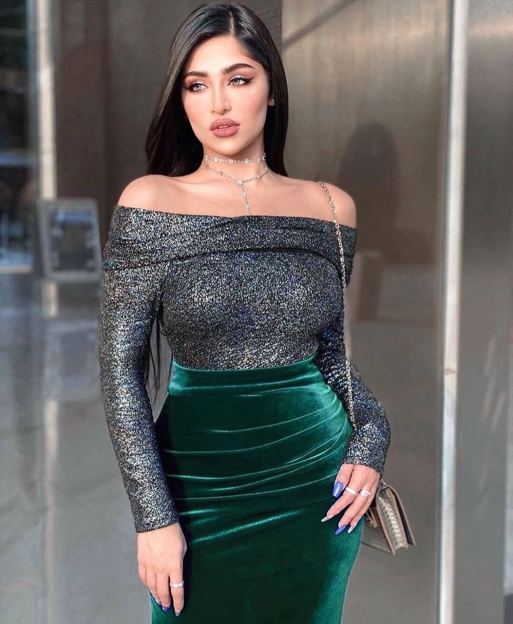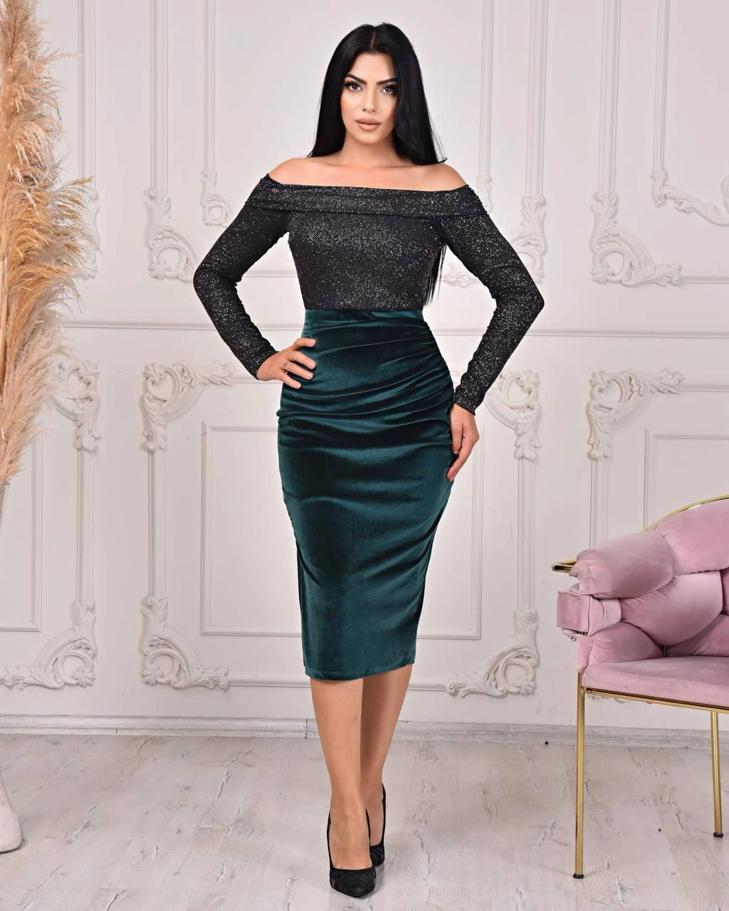 * Velvet green midi dress.
