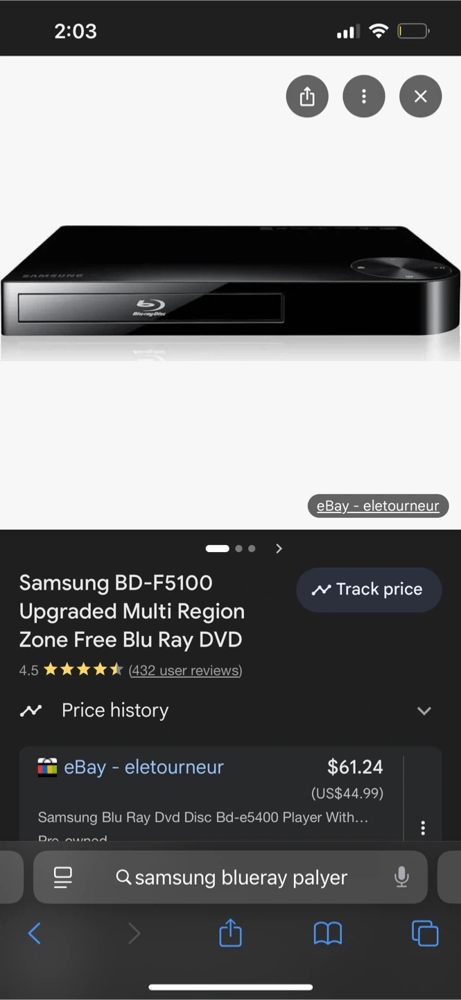 Selling a Samsung Blu-Ray player in good condition. It's a black model, compatible with DVD and Blu-Ray discs. Comes with power cable.