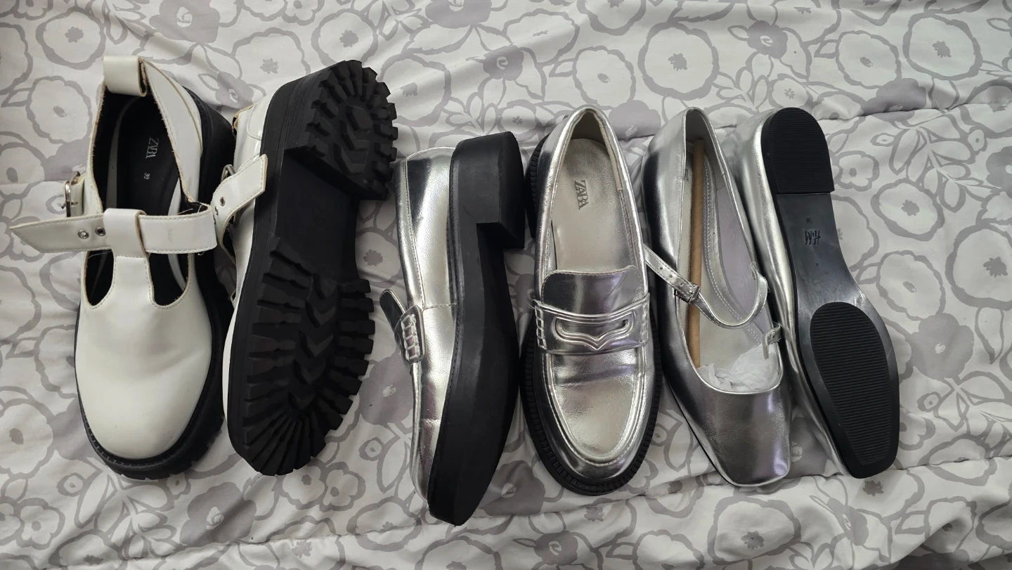 Selling a collection of shoes! There's a pair of white and black Zara Mary Janes, a pair of silver Zara loafers, and a pair of silver H&M flats. All are size 7 and in good condition