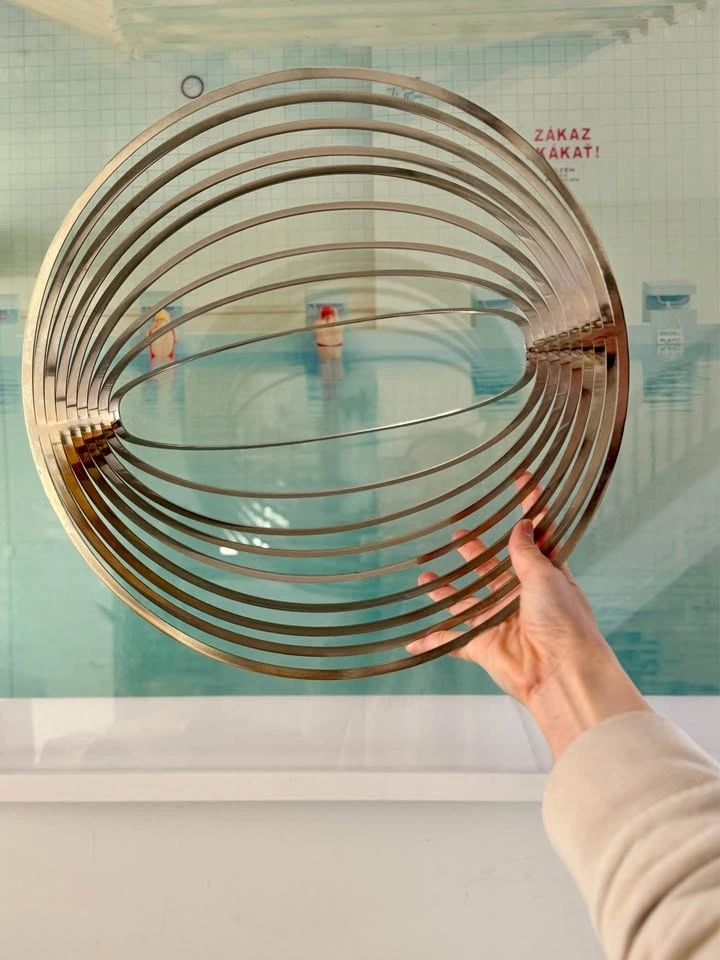 Material: polished metal with a mirror finish. Aesthetic: Clean lines, geometric, and functional art.