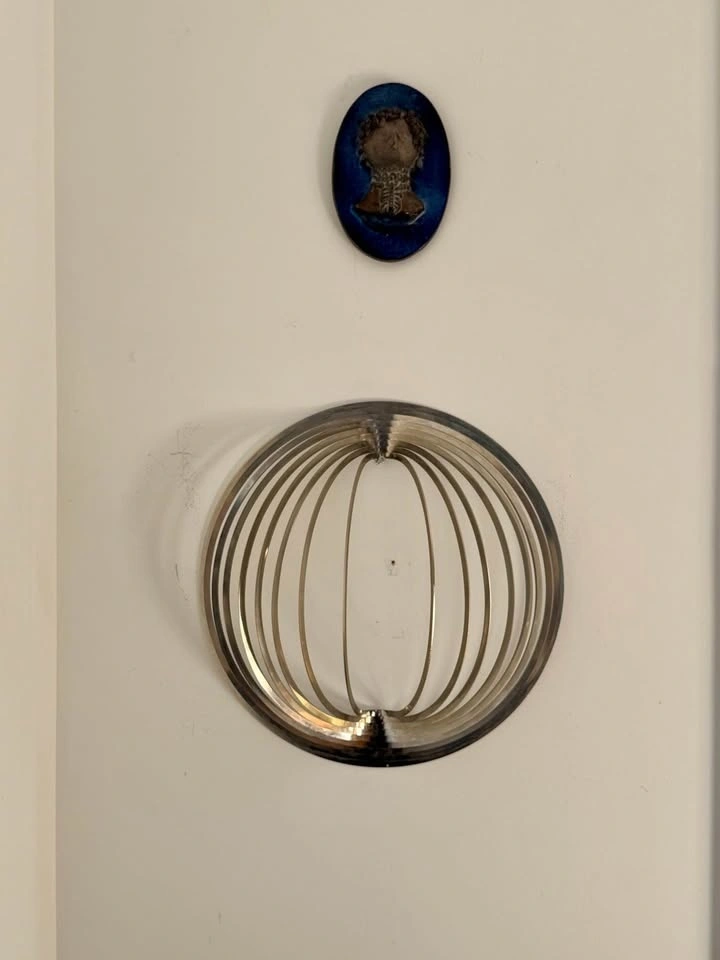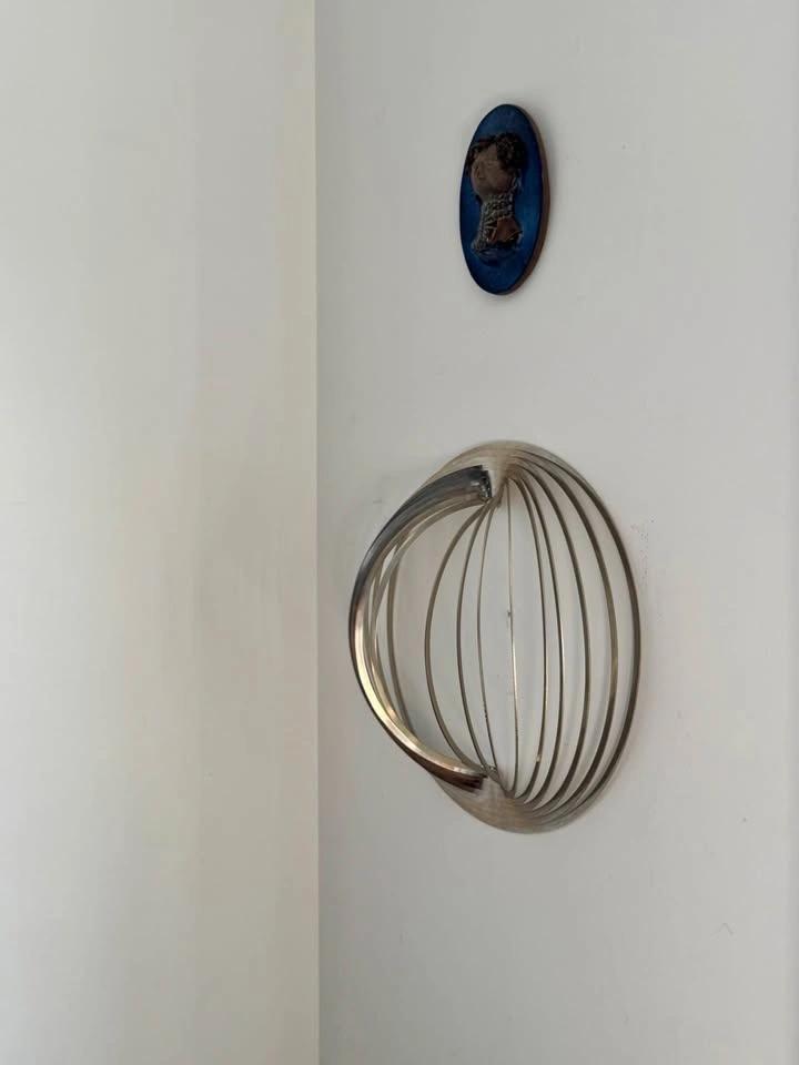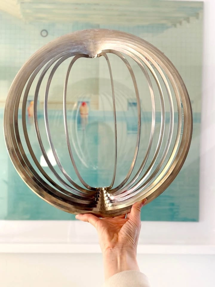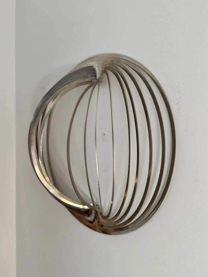 Material: polished metal with a mirror finish. Aesthetic: Clean lines, geometric, and functional art.
