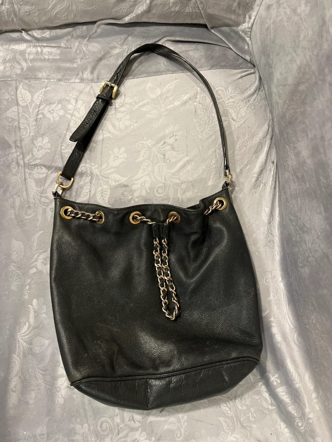 A black leather drawstring shoulder bag featuring a stylish chain detail. It has a durable leather construction with gold-tone hardware. This bag is a classic accessory for everyday use.