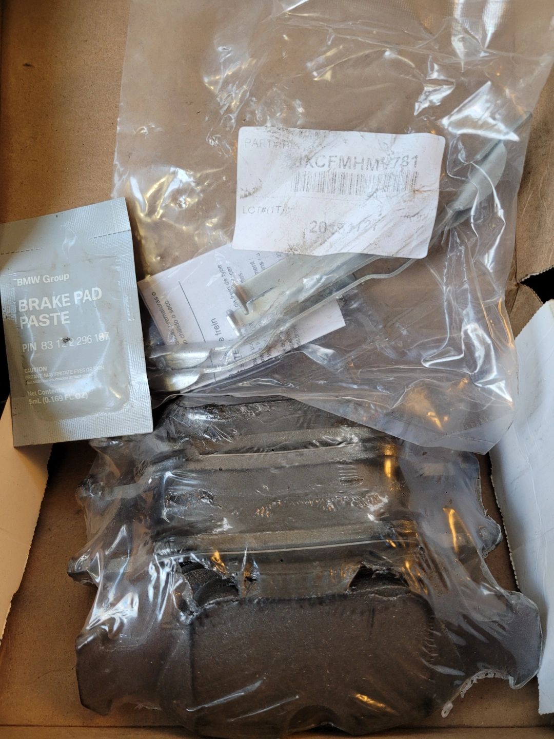 New in box. Set of four front pads. Includes brake pad, and extras: new hardware and Bmw paste. Made in the US. Semi metalic, quieter braking, more stopping power.