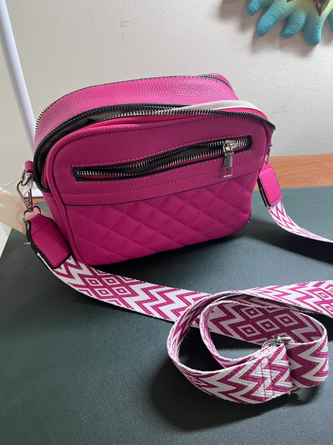 This stylish crossbody bag comes in a vibrant hot pink with a diamond-stitched exterior. It features a woven strap with a pink and white geometric pattern. Includes two zippered compartments for organized storage. A great everyday accessory!