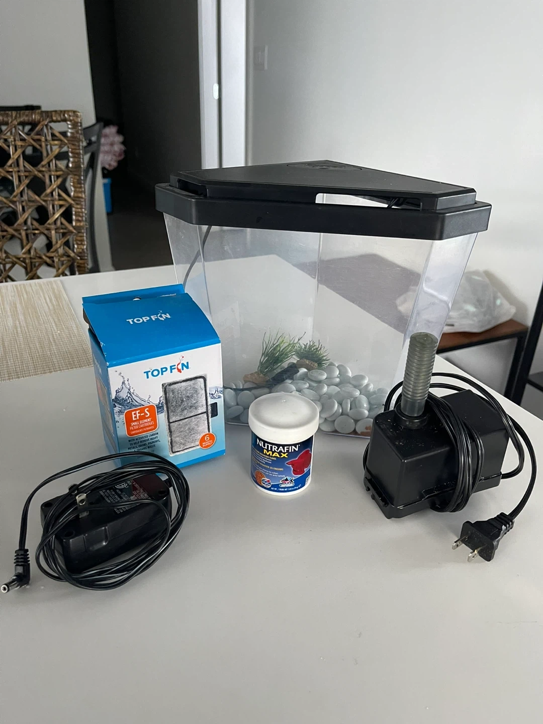 This is a TOP FIN 5-gallon aquarium starter kit. It includes a filter, power adapter, and Nutrafin Max fish food. This setup is perfect for beginner fish keepers!