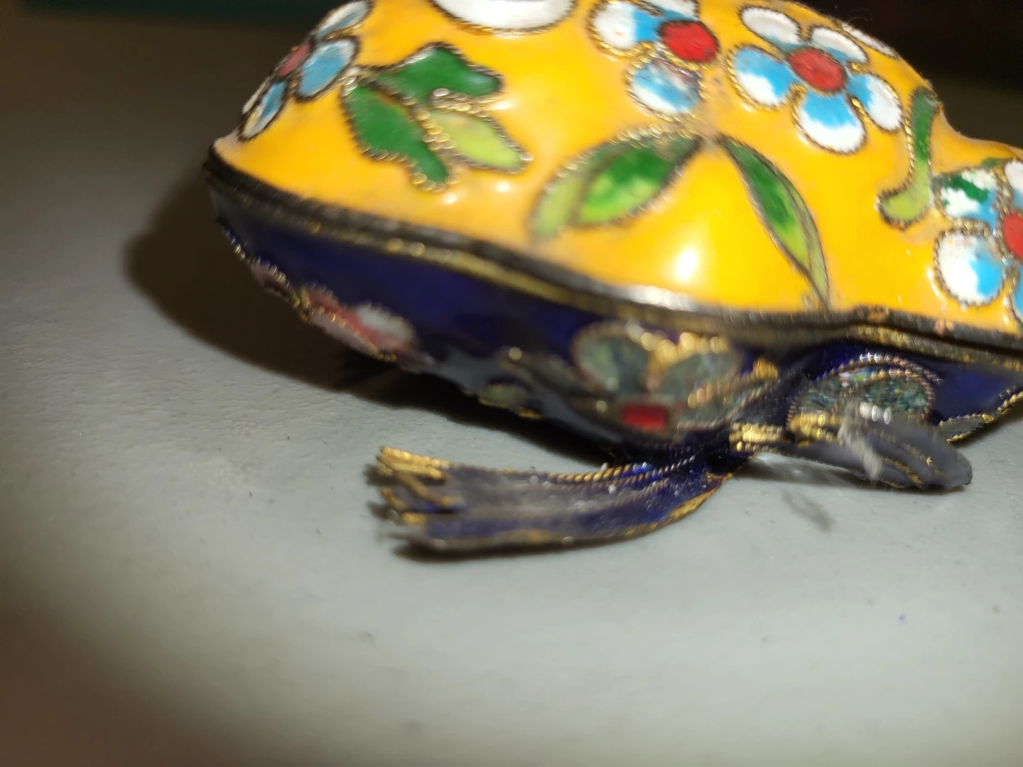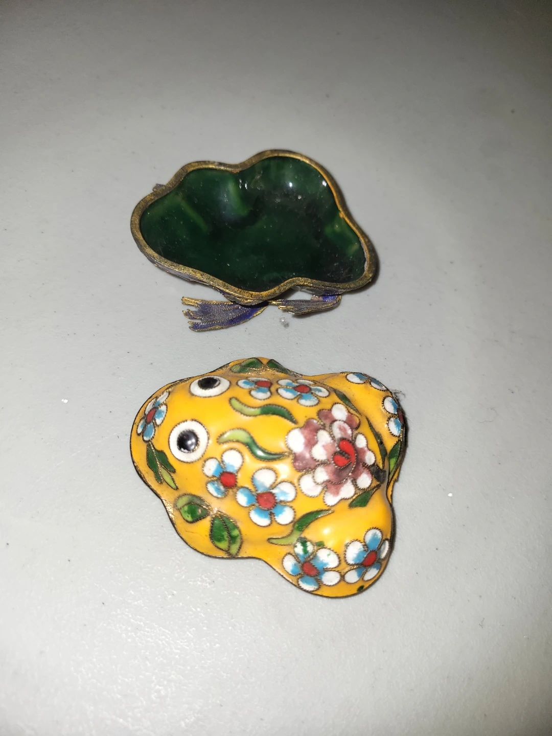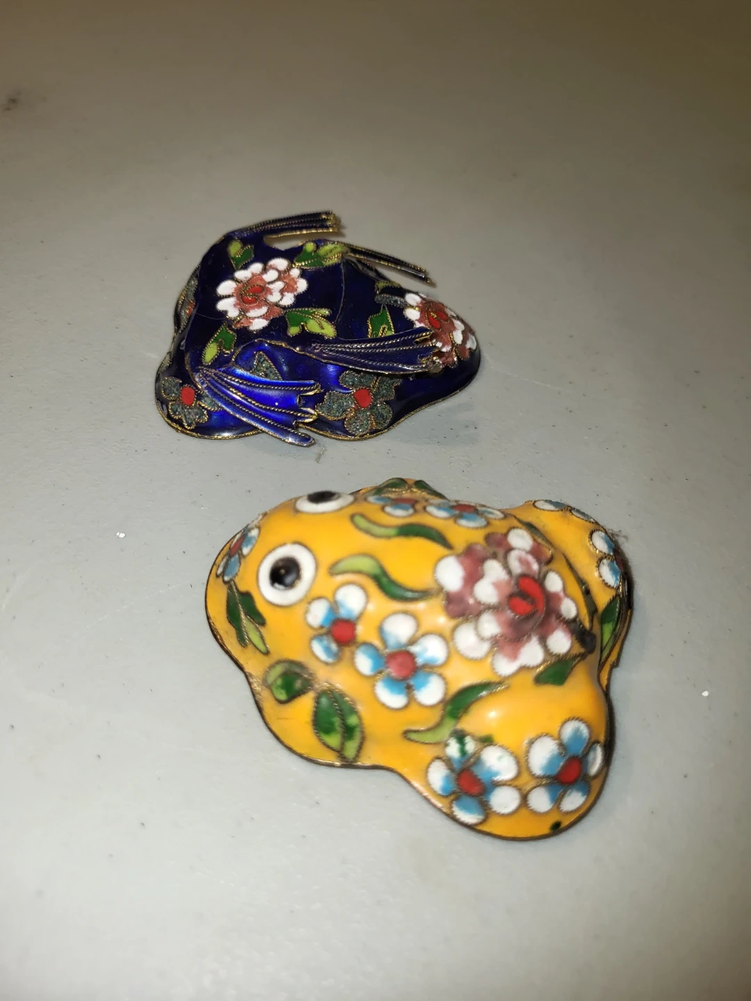 Buy & SellYellow Cloisonné Frog FigurineYellow Cloisonné Frog Figurine$35Decorative yellow cloisonné figurine shaped like a frog. It's adorned with floral patterns in white, red, and blue. The item is small and detailed.WHERE TO MEETCheck LocationView MapSELLERverifiedChristyMcKernan761 review1 chats·0 favorites·9 viewsSEND CHAT TO SELLERHi Christy! I’m interested in your listing.Hi Christy! I’m interested in your listing.Get the Karrot app to chatSign In to chat