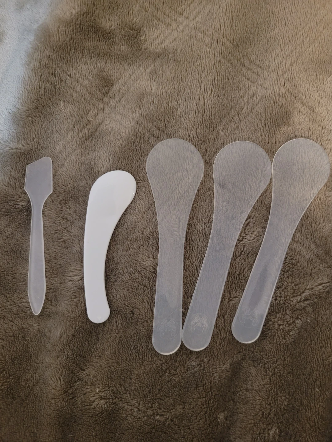 Seven cosmetic spatulas. They're made of plastic and are suitable for applying creams or masks.