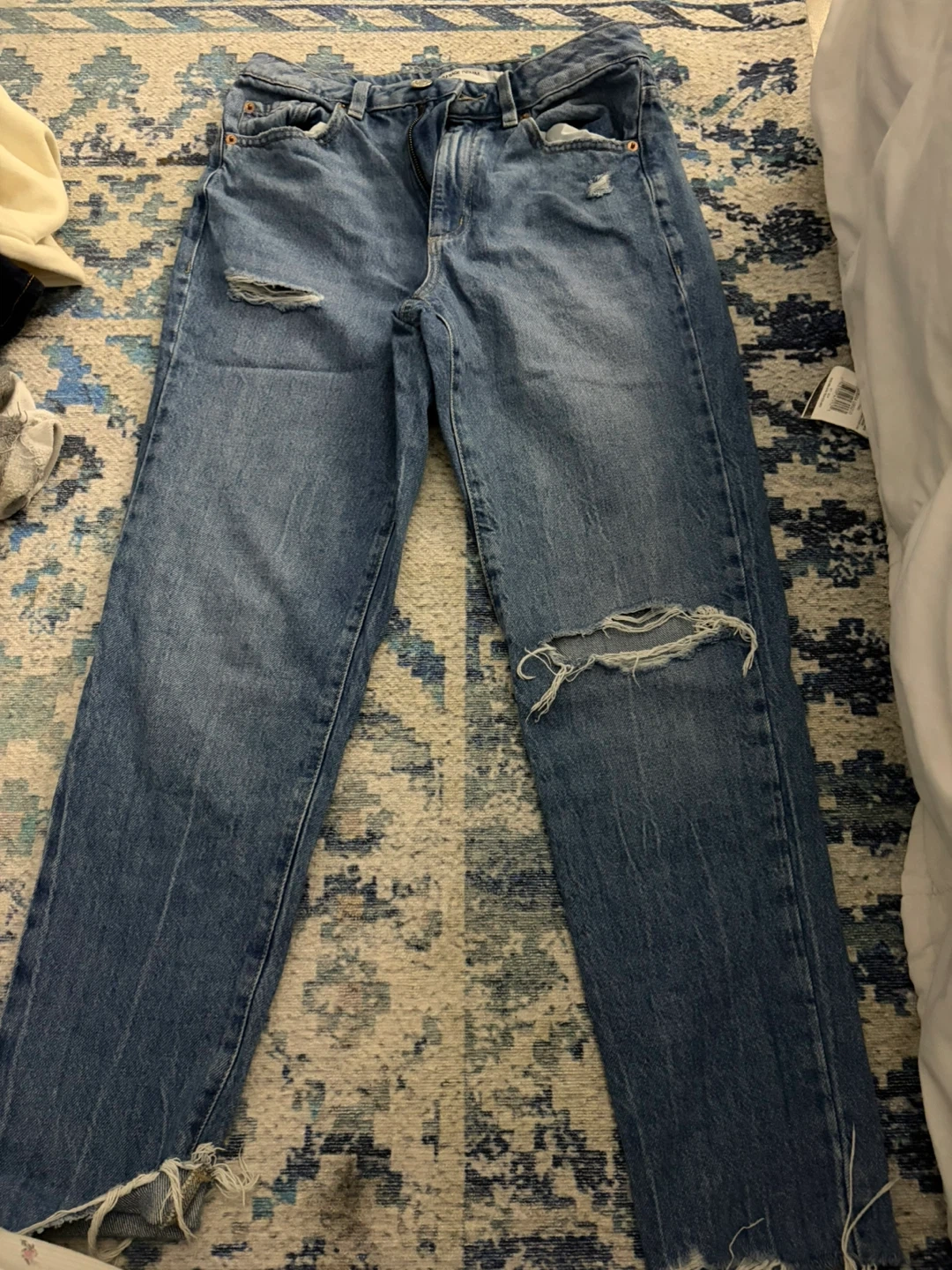 These are Garage Denim mom jeans in a medium wash. They feature distressed detailing and a relaxed fit. Perfect for everyday wear!