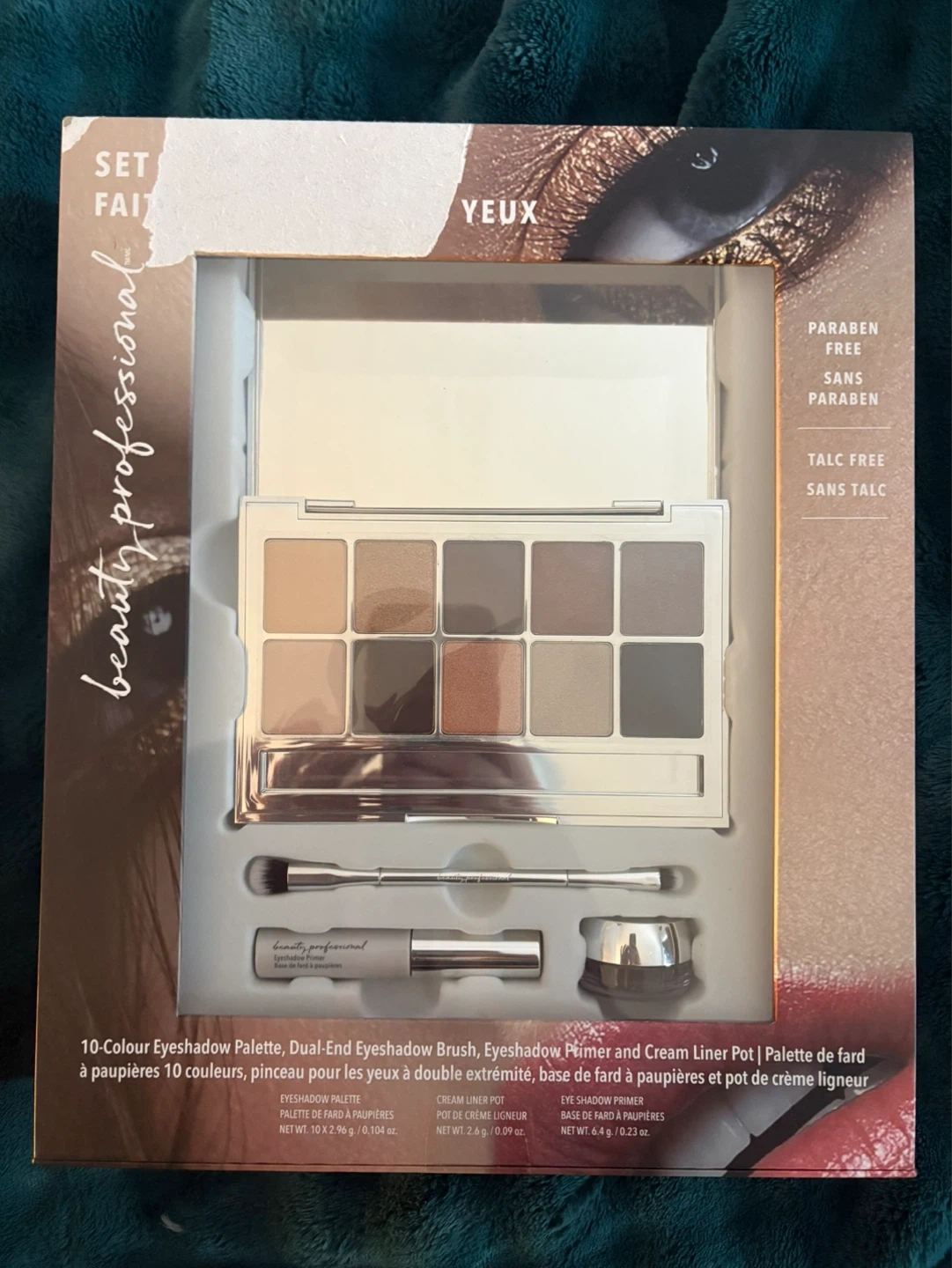 This 10-colour eyeshadow palette includes a dual-ended brush, eyeshadow primer, and cream liner pot.