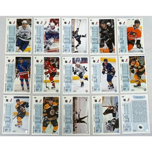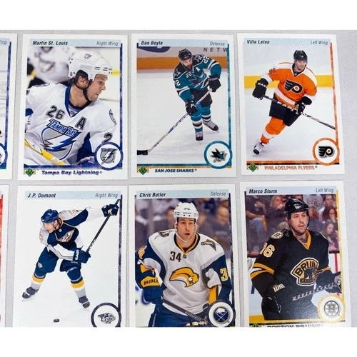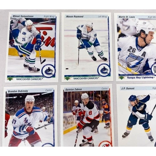 Lot of 15 cards from the 2010-2011 Upper Deck 20th Anniversary set, including parallels and Young Guns. Cards included are: Mikael Samuelsson #11, Mason Raymond #12, Martin St-Louis #22, Dan Boyle #35, Ville Leino #58, Brandon Dubinsky #71, Dainius Zubrus #82, J.P. Dumont #91, Chris Butler #174, Marco Strum #180, David Krejci #184, Michael Ryder #185, Corey Perry #195, Jonas Hiller #197, and Tommy Wingels Young Guns #243. Each card is shipped in a penny sleeve and top-loader.