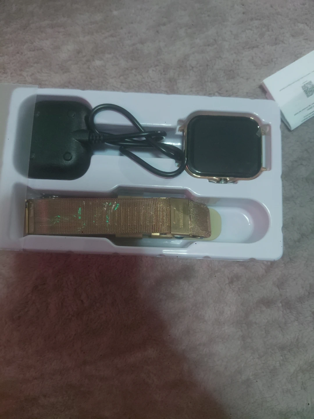 LIGE smartwatch in rose gold. It includes the watch, a rose gold mesh band, a beige strap, and a charging cable. It's perfect for tracking your daily activities and staying connected!