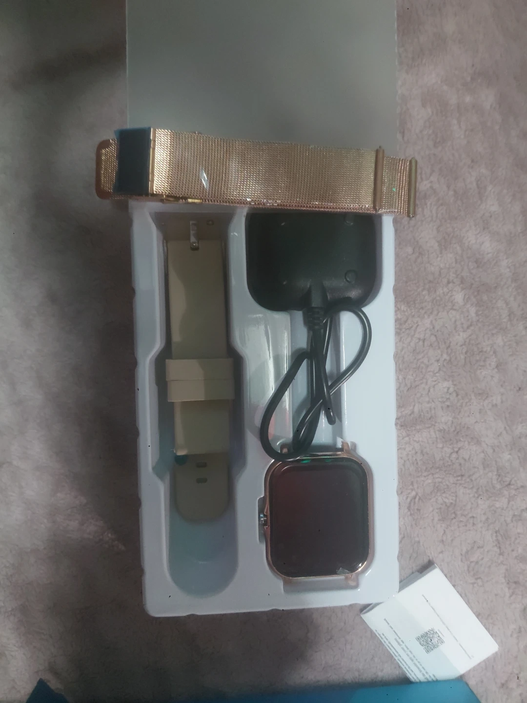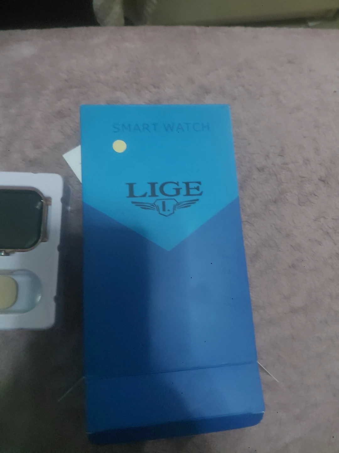 LIGE smartwatch in rose gold. It includes the watch, a rose gold mesh band, a beige strap, and a charging cable. It's perfect for tracking your daily activities and staying connected!