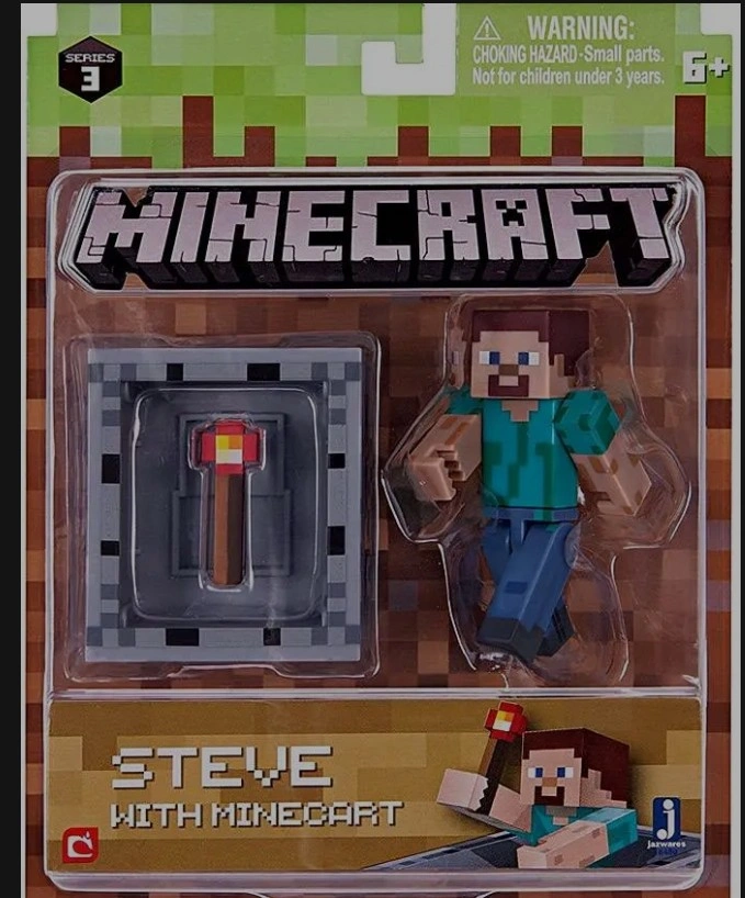 Collectible Minecraft action figure. Includes Steve figure and minecart accessory. Suitable for ages 6 and up. New, in original packaging.