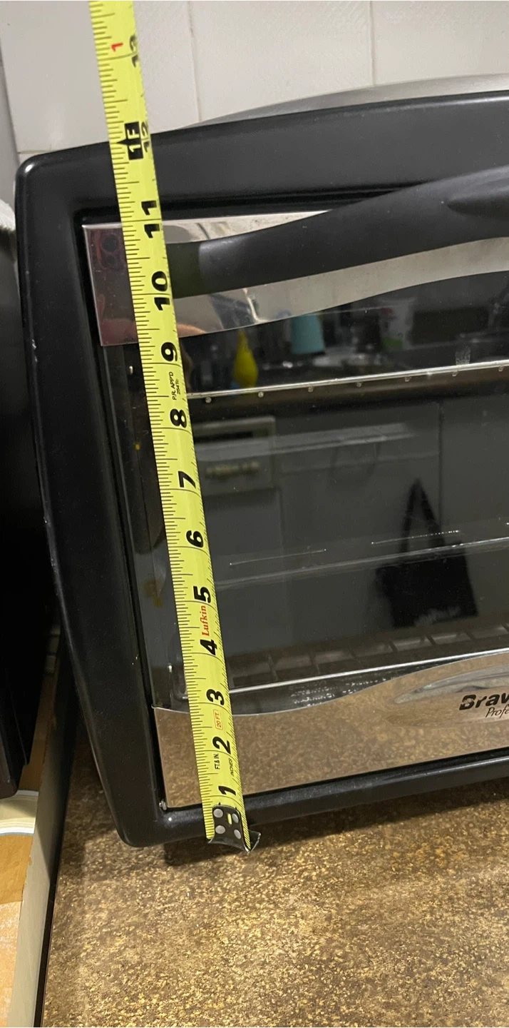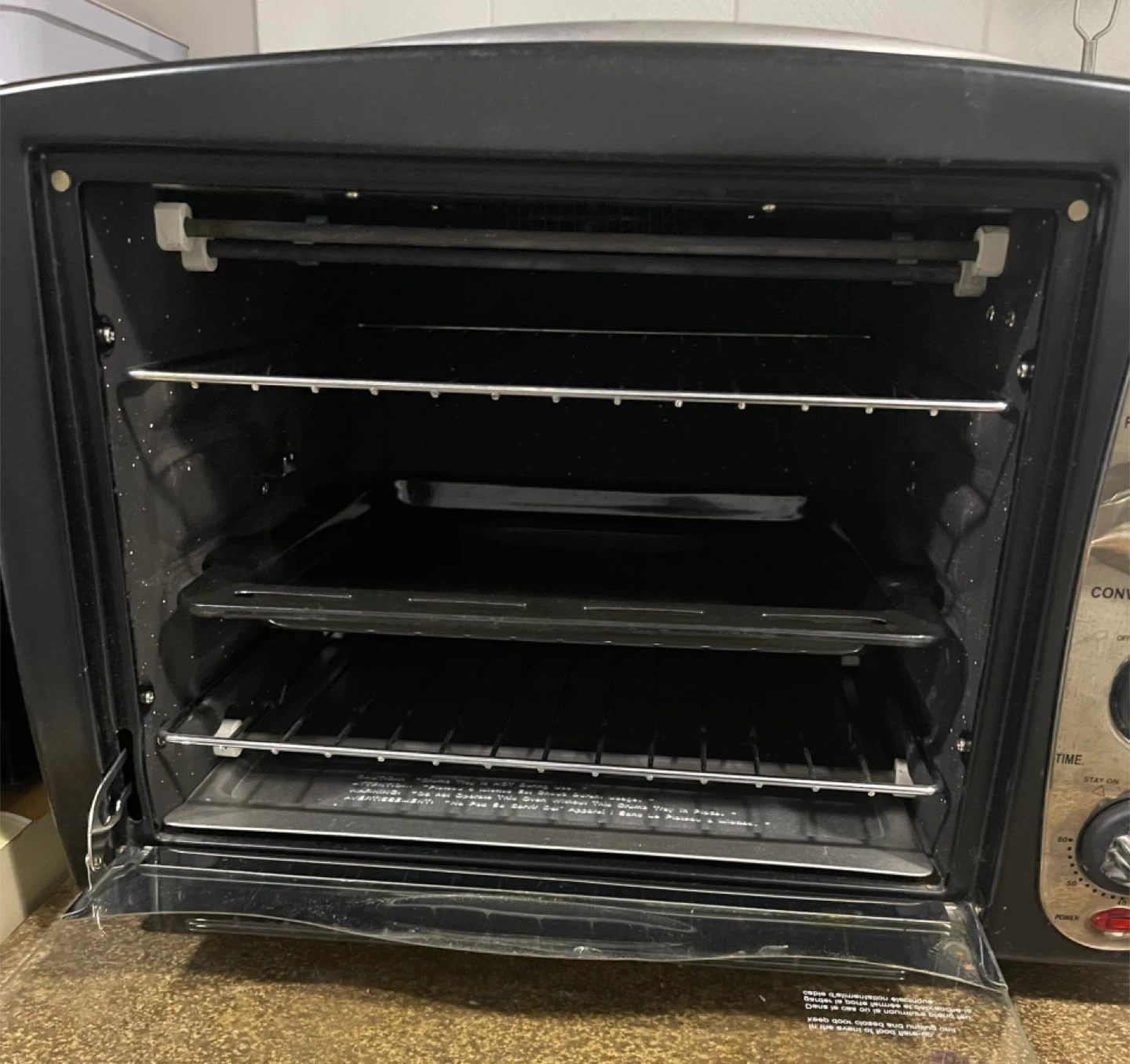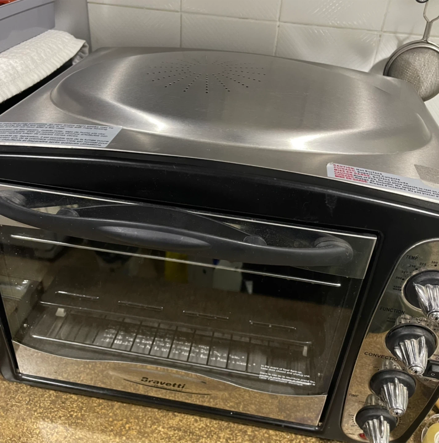 This Bravetti Professional toaster oven is black and silver. It includes multiple racks and a crumb tray. It has convection settings and a timer.