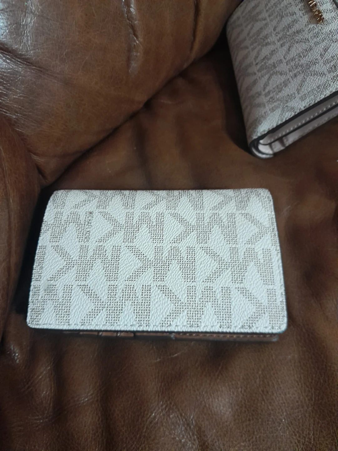 Michael Kors Jet Set wallet in vanilla and luggage color. This compact wallet features the MK signature print. It has multiple card slots and a clear ID window. Comes with original tags attached. 9 card pockets, 1 ID pocket, 2 bill fold pockets zipper pocket, 5" long, 3 1/2" high, brand new with tags retails$98.00 your choice $30.00